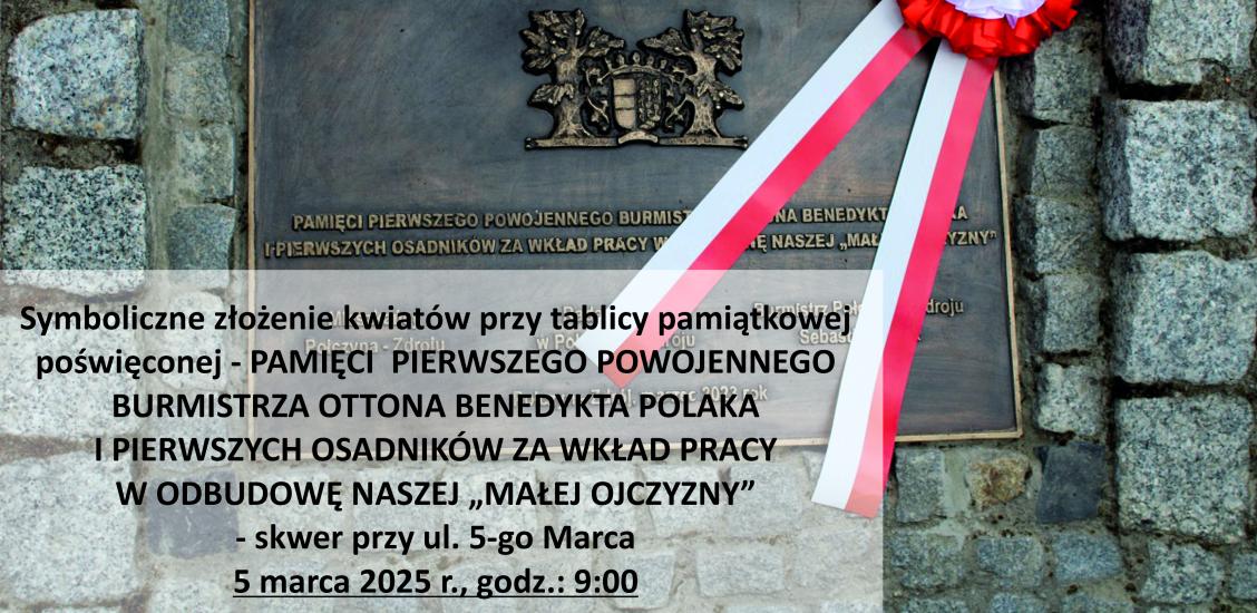 Symboliczne złożenie kwiatów przy tablicy pamiątkowej poświęconej - PAMIĘCI PIERWSZEGO POWOJENNEGO BURMISTRZA OTTONA BENEDYKTA POLAKA I PIERWSZYCH OSADNIKÓW ZA WKŁAD PRACY W ODBUDOWĘ NASZEJ „MAŁEJ OJCZYZNY” - skwer przy ul. 5-go Marca,