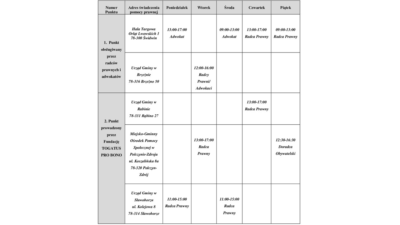 W 2026 r. na terenie Powiatu Świdwińskiego nieodpłatnej pomocy prawnej, nieodpłatnego poradnictwa obywatelskiego oraz edukacji prawnej udzielać będą: