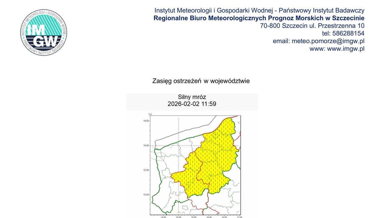 OSTRZEŻENIE METEOROLOGICZNE 02.02.2026 R.- 07.02.2026 R. MOŻLIWY SILNY MRÓZ I OPADY MARZNĄCE…