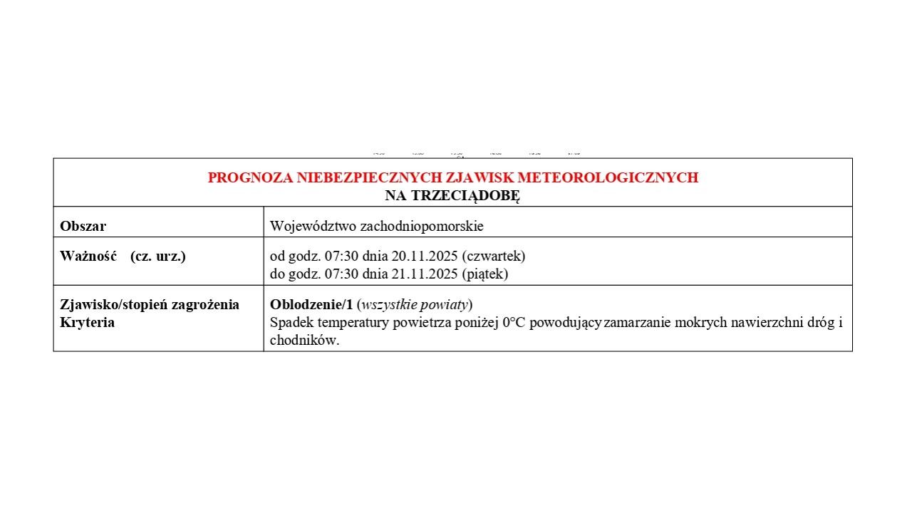 OSTRZEŻENIE METEOROLOGICZNE 19.11.2025 R.- 22.11.2025 R. MOŻLIWE OBLODZENIA…