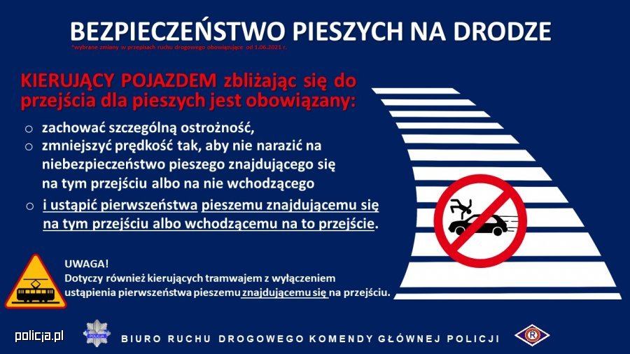 Nowe regulacje nie zwalniają również pieszego z obowiązku zachowania szczególnej ostrożności podczas wchodzenia i przechodzenia przez jezdnię lub torowisko oraz korzystania z przejścia dla pieszych. W dalszym ciągu zabrania się także pieszemu wchodzenia na jezdnię bezpośrednio przed jadący pojazd, w tym również na przejściu dla pieszych.