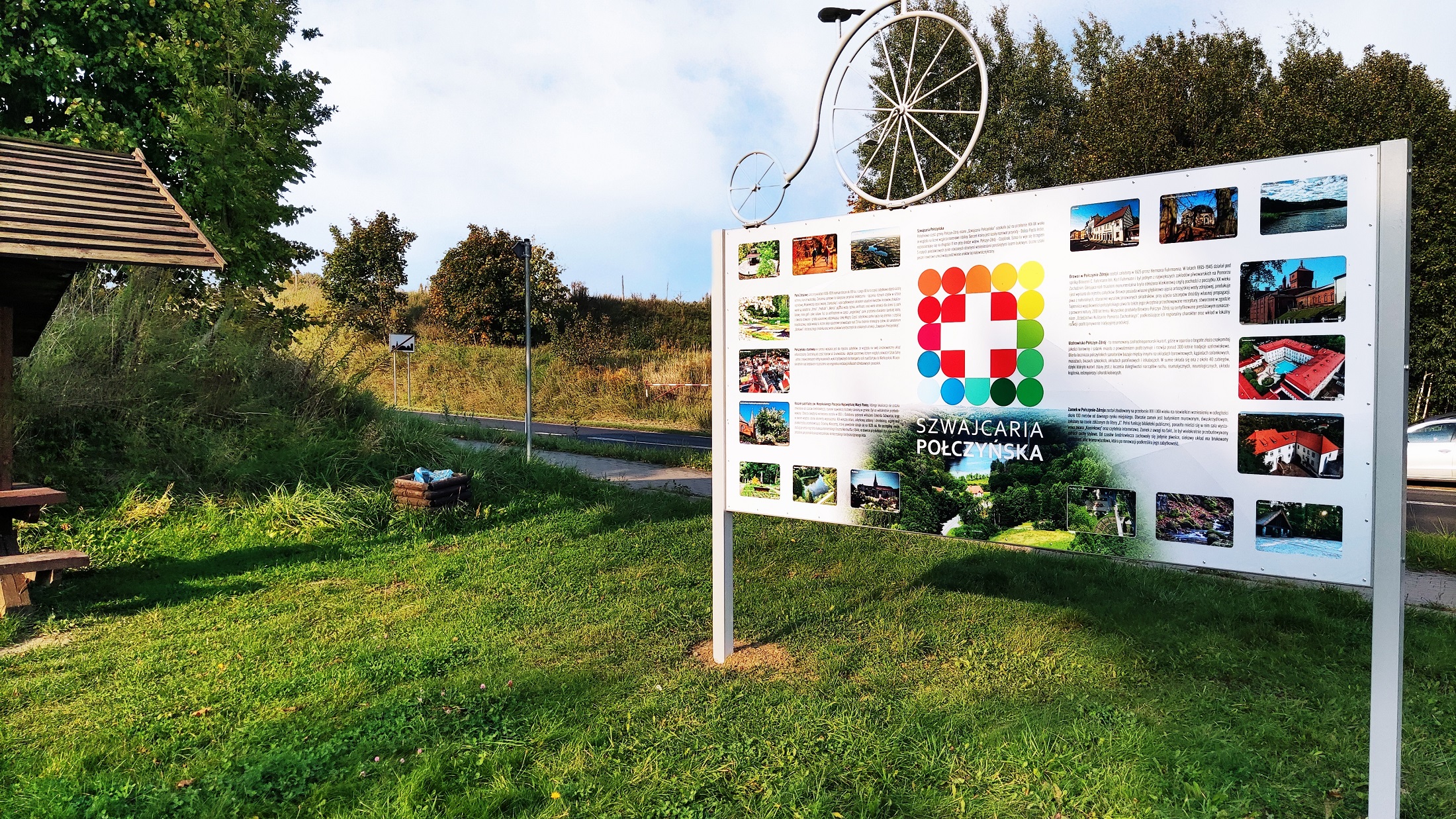 Bicykl jest widoczny z drogi Połczyn-Świdwin. To wjazd na ścieżkę rowerową