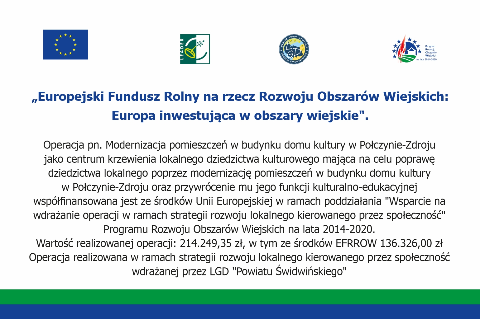 Zadanie było realizowane na podstawie umowy o dofinansowanie w ramach Programu Rozwoju Obszarów Wiejskich na lata 2014-2020, w ramach poddziałania 19.2 Wsparcie na wdrażanie strategii rozwoju lokalnego kierowanego przez społeczność. Celem operacji była poprawa dziedzictwa lokalnego poprzez modernizację pomieszczeń w budynku domu kultury w Połczynie-Zdroju oraz przywrócenie mu jego funkcji kulturalno-edukacyjnej. Operacja w ramach poddziałania „Wsparcie na wdrażanie operacji w ramach strategii rozwoju lokalnego kierowanego przez społeczność” w ramach działania „Wsparcie dla rozwoju lokalnego w ramach inicjatywy LEADER” objętego Programem w zakresie 4.5 Zachowanie dziedzictwa lokalnego”.