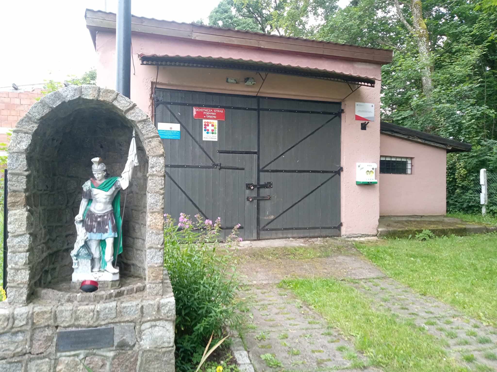 na budynku portierni firmy, przy ścieżce rowerowej i drodze wojewódzkiej nr 152