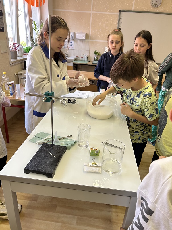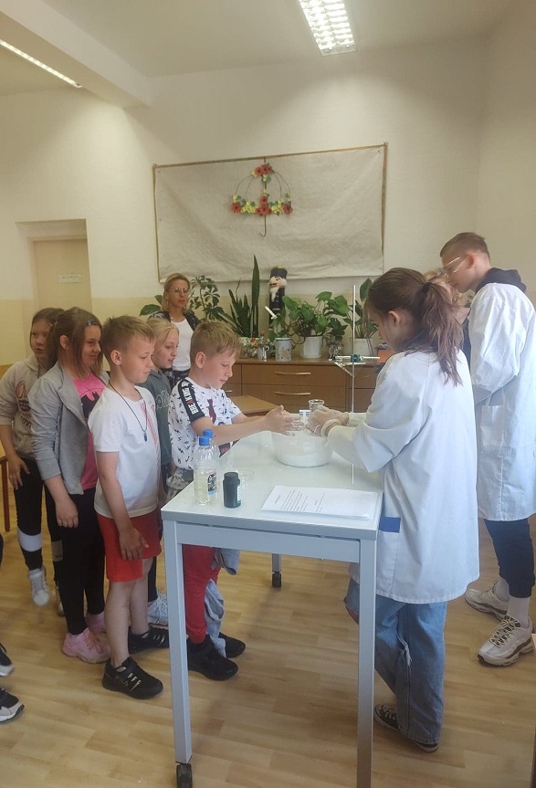 Uczniowie z klas ósmych, Zosia Glezner oraz Miłosz Stępień, pod okiem nauczyciela chemii przygotowali doświadczenia chemiczne dla swoich kolegów z klas czwartych. W ten sposób chcieli zachęcić widzów do nauki chemii oraz pokazać efektowność, mądrość i niezliczone tajemnice, jakie kryje ta dziedzina nauk przyrodniczych. Uczniowie, wykonując doświadczenia, zaprezentowali umiejętności bezpiecznego posługiwania się sprzętem laboratoryjnym oraz  odczynnikami chemicznym. Nauczyciel chemii  wyjaśniał przebieg procesów chemicznych zachodzących podczas doświadczeń.