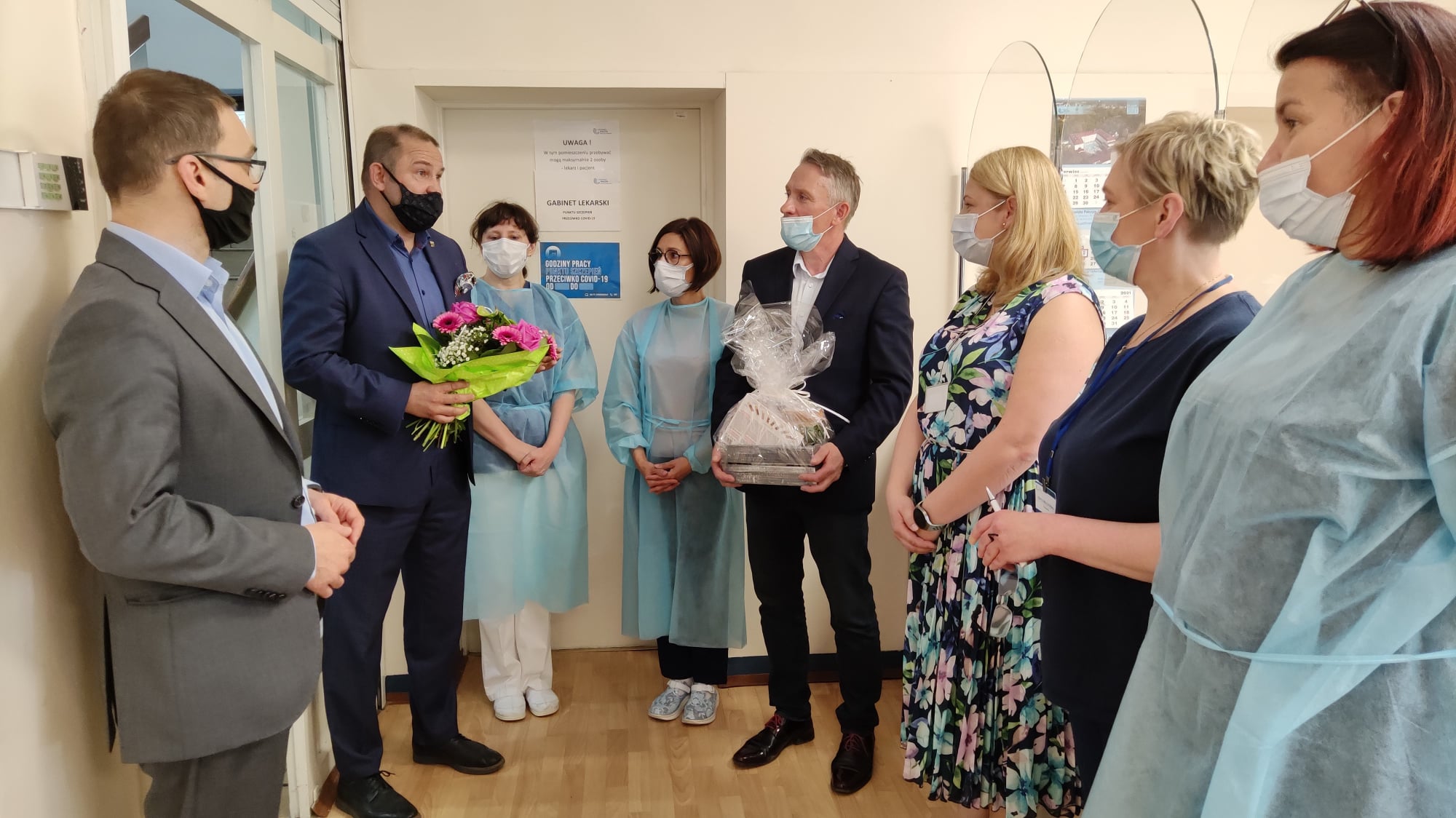 Bardzo zapracowaną kadrę w połczyńskim szpitalu oraz w Przychodni Uzdrowiskowej odwiedziła delegacja Ratusza – Burmistrz Sebastian Witek, Przewodniczący Ray Miejskiej Janusz Podpora oraz Sekretarz Gminy Jacek Brzozowski, składając wykonującym ten szlachetny zawód serdeczne podziękowania za ogromne zaangażowanie i poświęcenie w pracy dla zdrowia i dobra pacjentów, za empatię i ogromne serce. Burmistrz podkreślił, że praca ta jest tym bardziej cenna, iż wykonywana w historycznie trudnym momencie pandemii. Za to wszystko – ogromnie dziękujemy!
