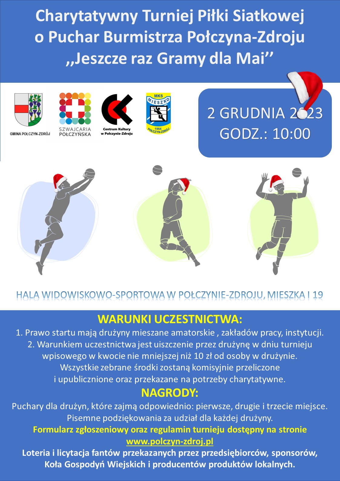Gmina Połczyn-Zdrój 2 grudnia 2023 r. organizuje Gminne Obchody Dnia Wolontariusza połączone z Charytatywnym Turniejem Piłki Siatkowej o Puchar Burmistrza Połczyna-Zdroju ,, Jeszcze raz Gramy dla Mai’’ w Hali Widowiskowo-Sportowej w Połczynie-Zdroju, ul. Mieszka I 19. Po raz kolejny chcemy wesprzeć naszą małą mieszkankę Maję Dąbrowską, która zmaga się z ciężką chorobą.