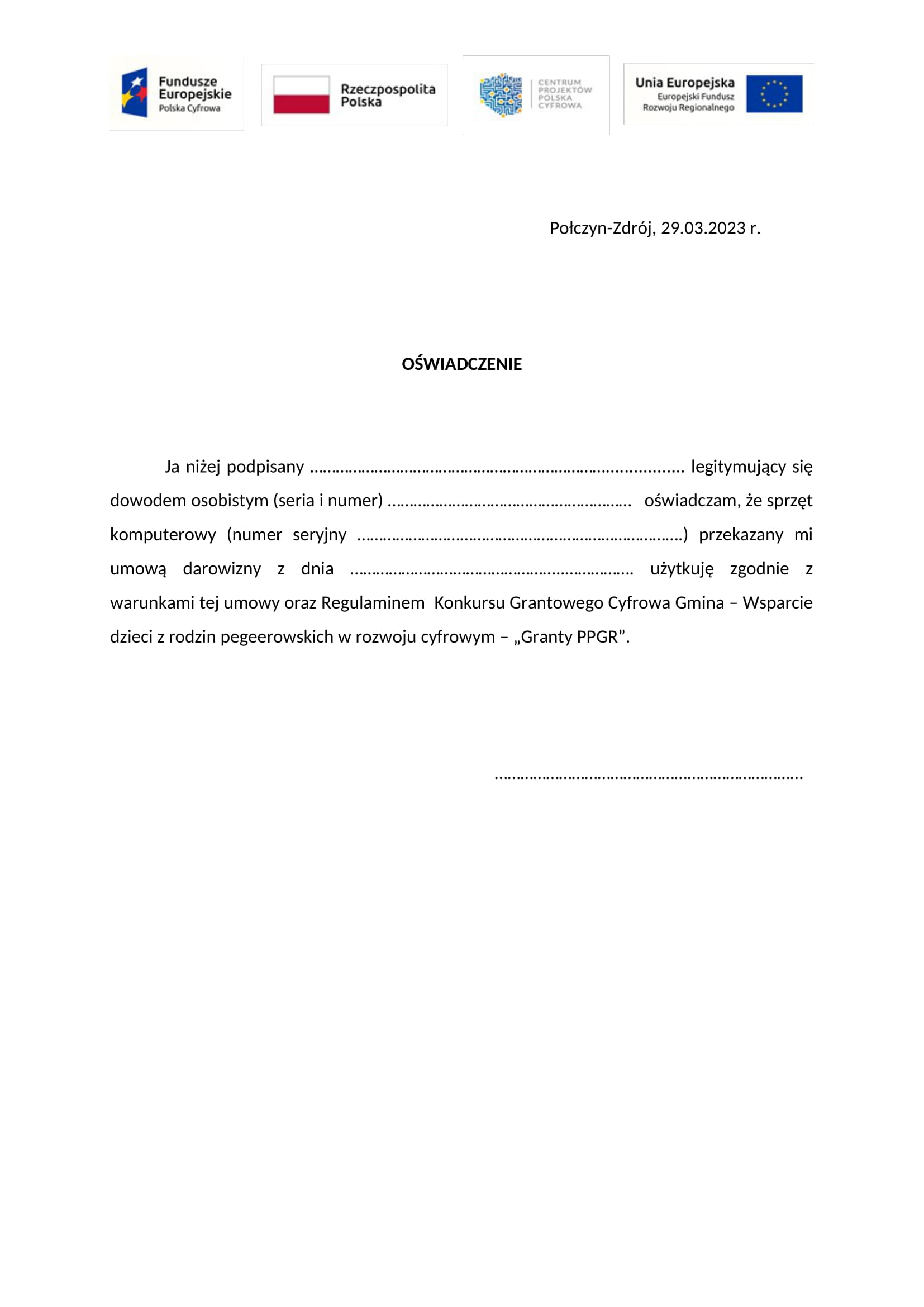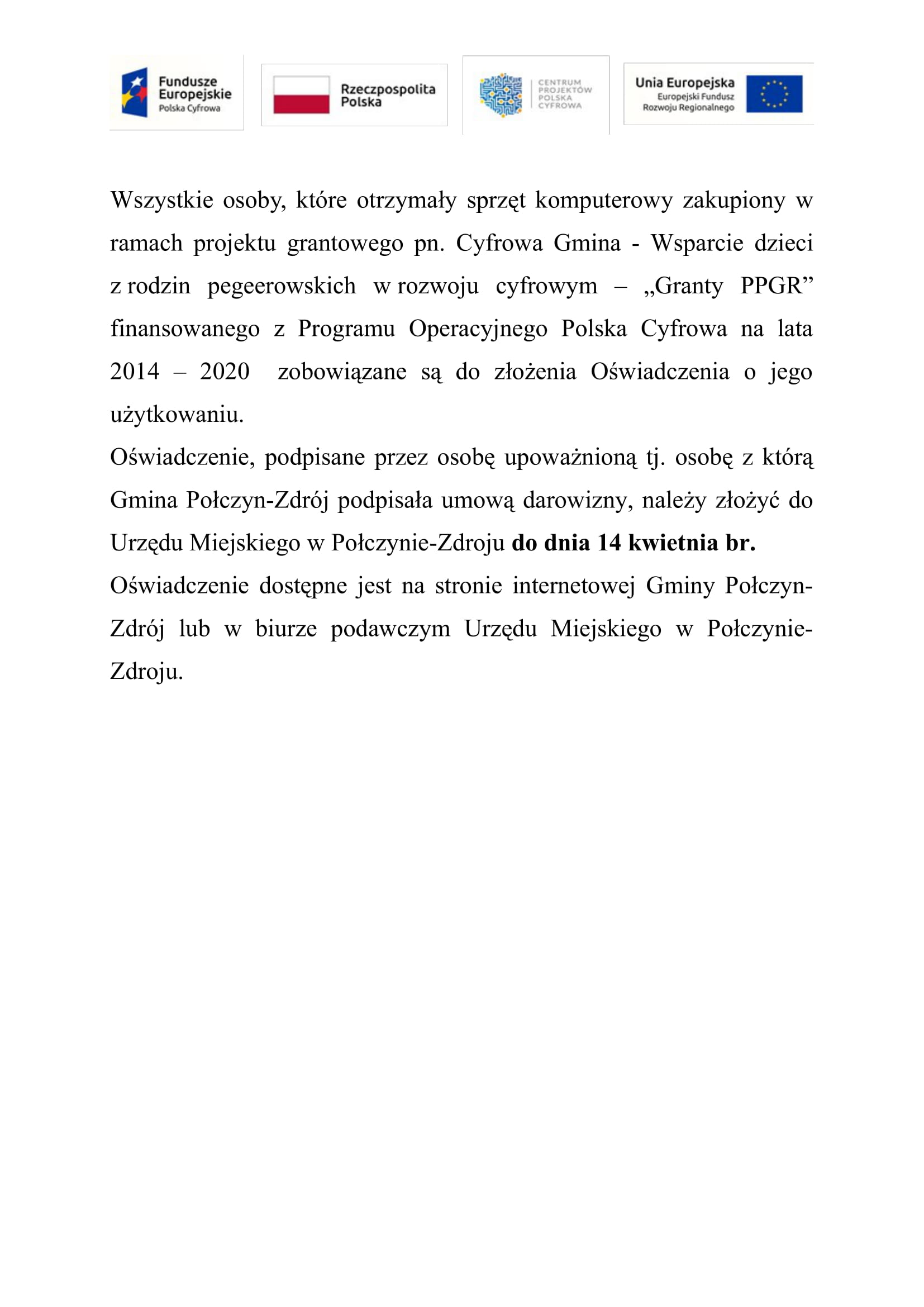 Projekt grantowy pn. Cyfrowa Gmina - Wsparcie dzieci z rodzin pegeerowskich w rozwoju cyfrowym – „Granty PPGR” finansowanego z Programu Operacyjnego Polska Cyfrowa na lata 2014 – 2020- złóż oświadczenie w Urzędzie Miejskim w Połczynie-Zdroju, jeśli otrzymałeś sprzęt komputerowy