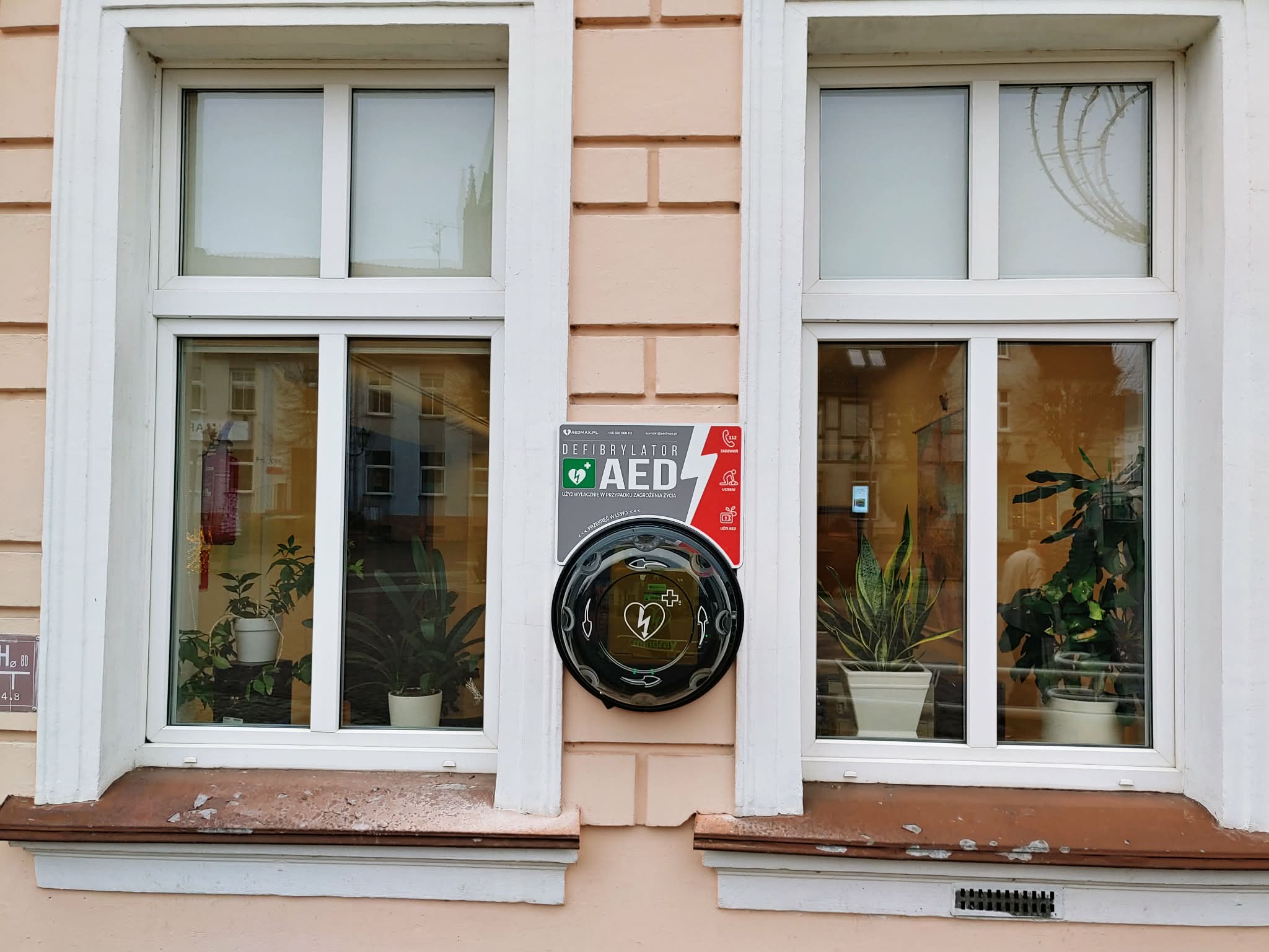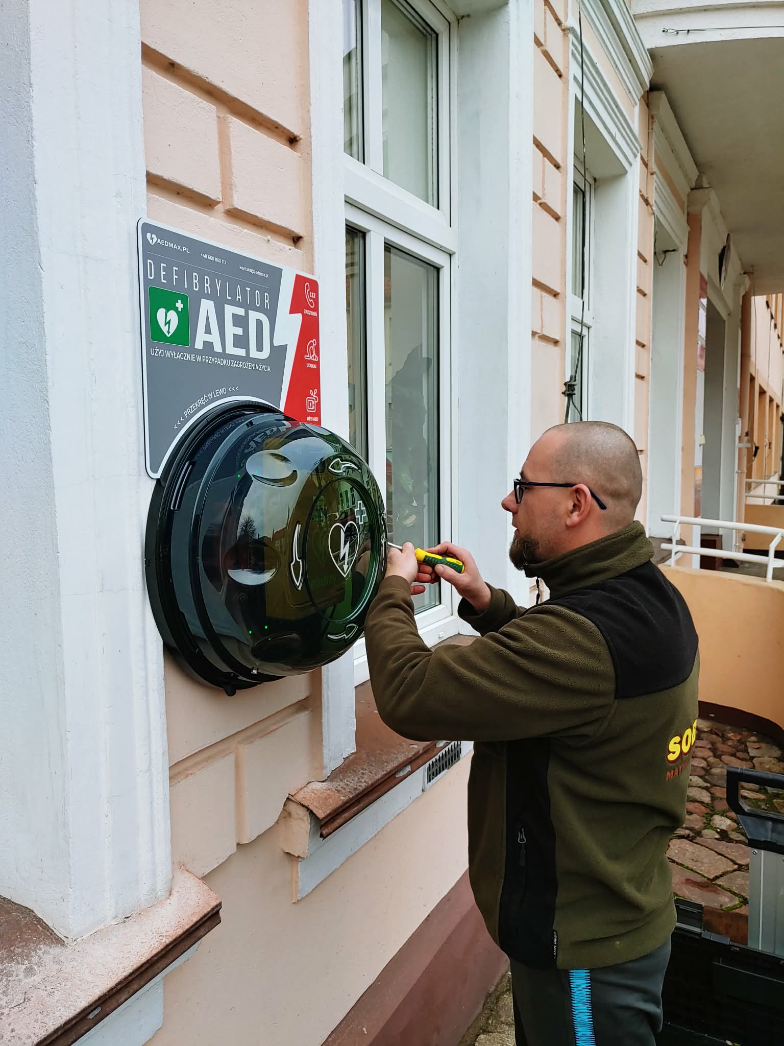 Instalacja zestawu AED na zewnątrz budynku Urzędu Miejskiego