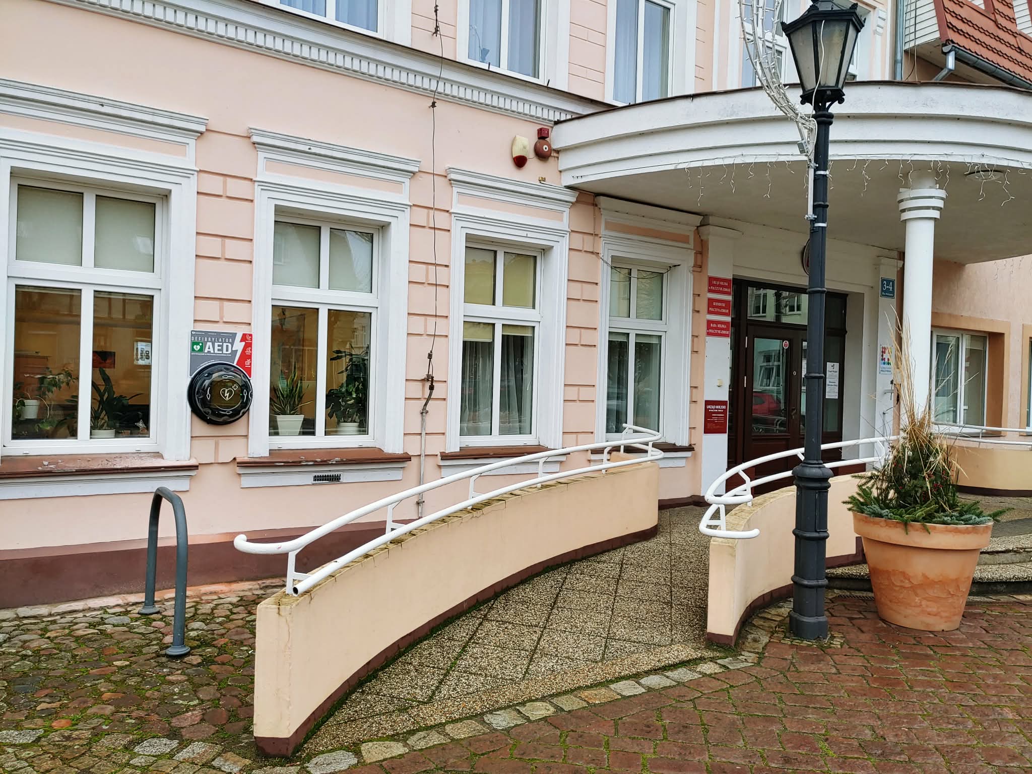 Jednym z przedsięwzięć grantowych była instalacja zestawu AED na zewnątrz budynku Urzędu Miejskiego.