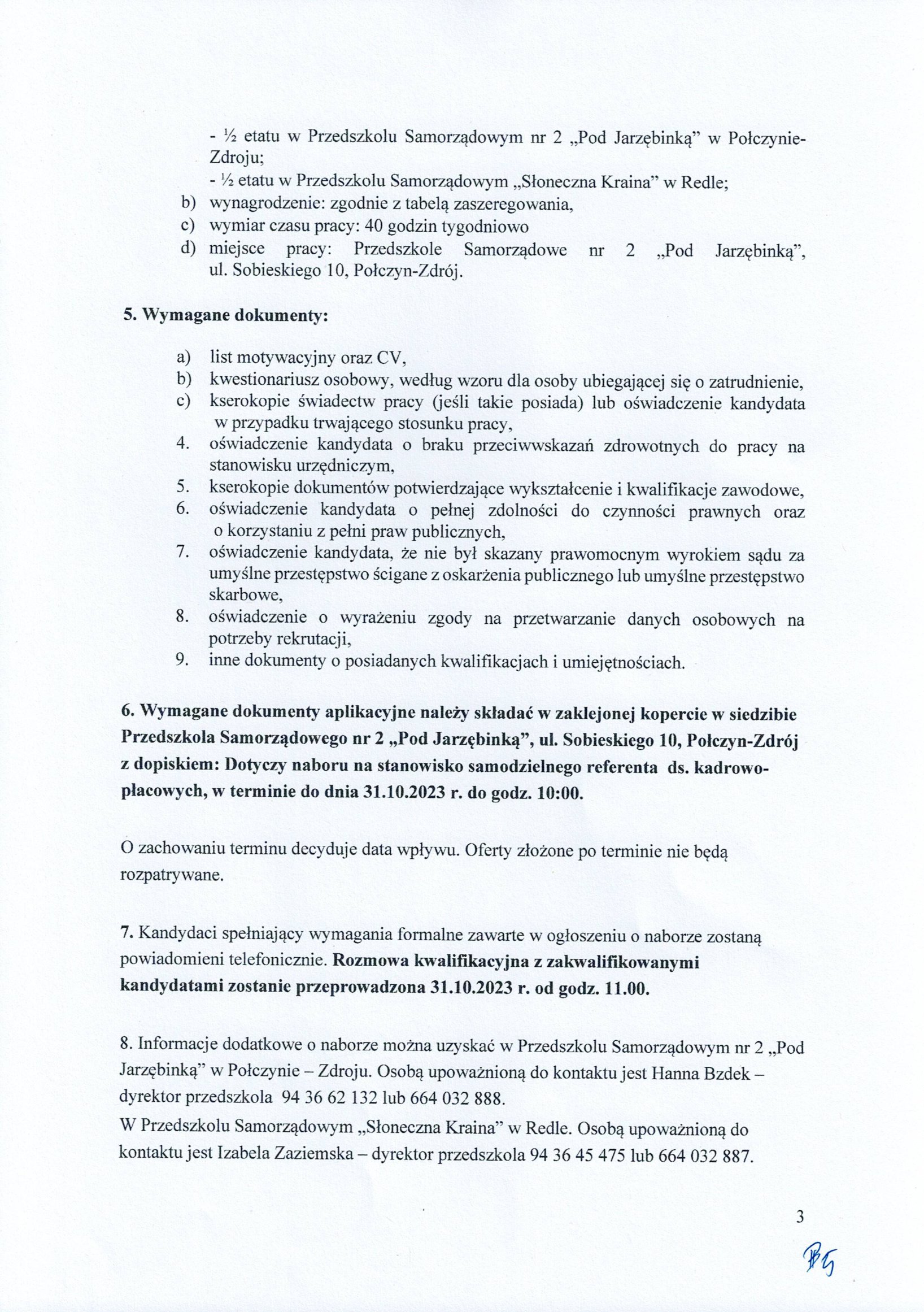 DYREKTOR PRZEDSZKOLA SAMORZĄDOWEGO NR 2 ,,POD JARZĘBINKĄ'' W POŁCZYNIE-ZDROJU ORAZ DYREKTOR PRZEDSZKOLA SAMORZĄDOWEGO ,,SŁONECZNA KRAINA'' W REDLE OGŁASZAJĄ NABÓR NA WOLNE STANOWISKO URZĘDNICZE SAMODZIELNEGO REFERENTA DS. KADROWO-PŁACOWYCH