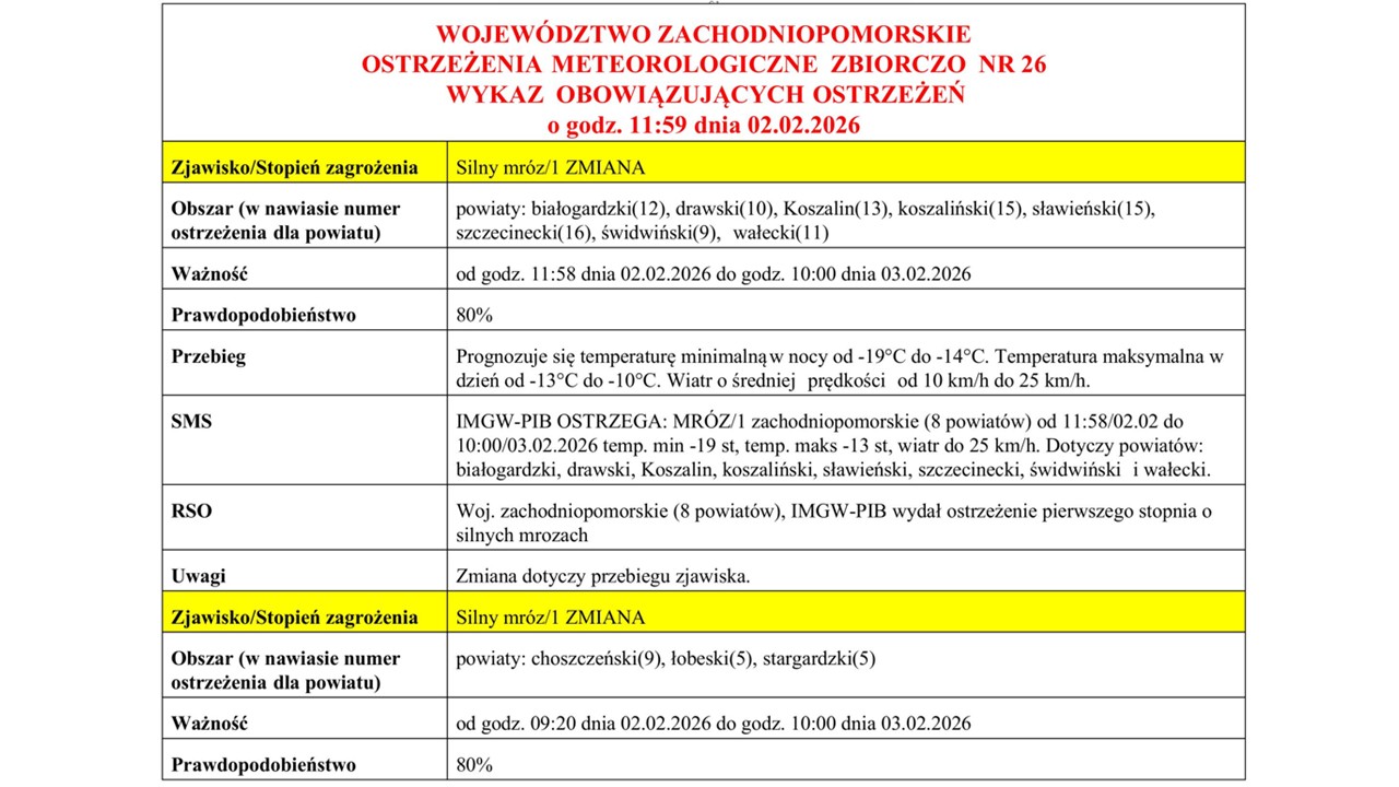 OSTRZEŻENIE METEOROLOGICZNE 02.02.2026 R.- 07.02.2026 R. MOŻLIWY SILNY MRÓZ I OPADY MARZNĄCE…