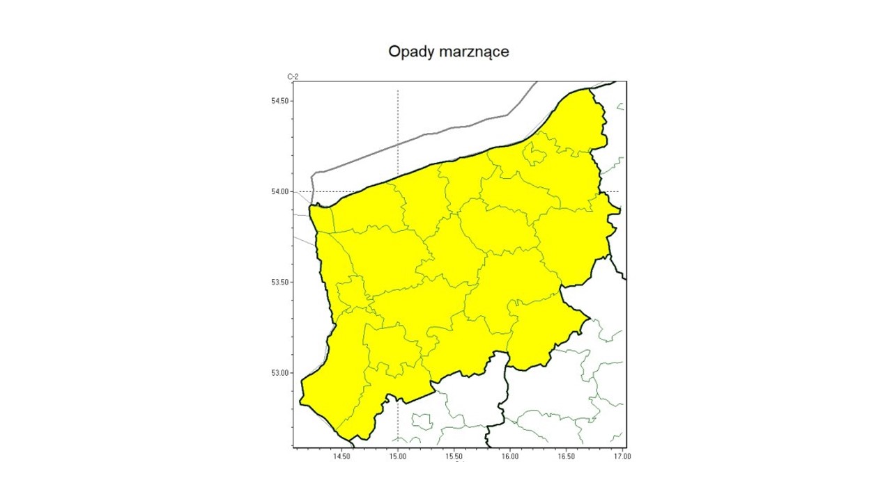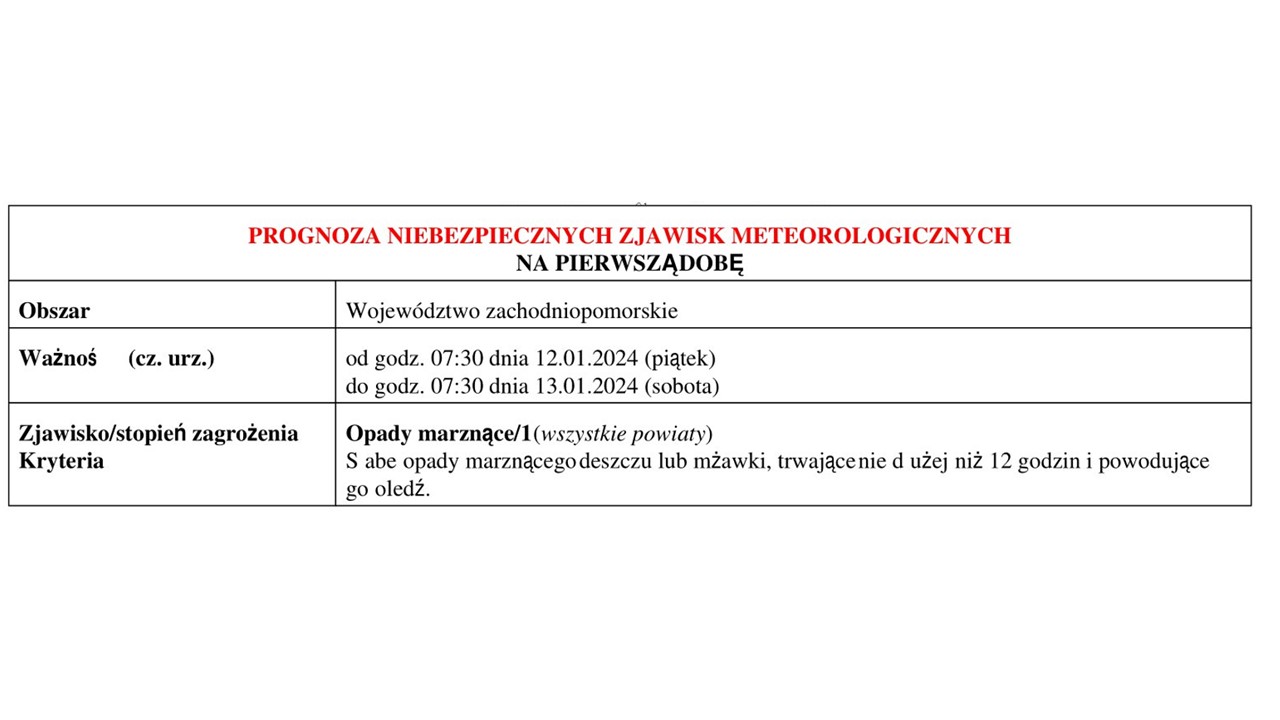 OSTRZEŻENIE METEOROLOGICZNE 12.01. - 13.01.2024 R. MOŻLIWE OPADY MARZNĄCE