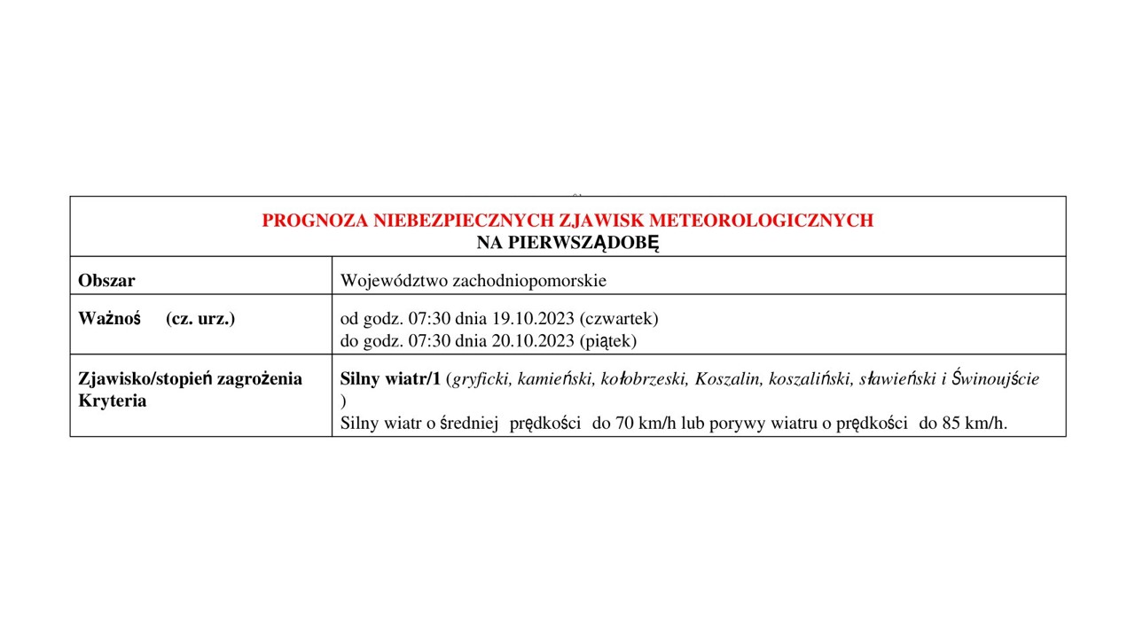 OSTRZEŻENIE METEOROLOGICZNE 19-20.10.2023 R. MOŻLIWY SILNY WIATR