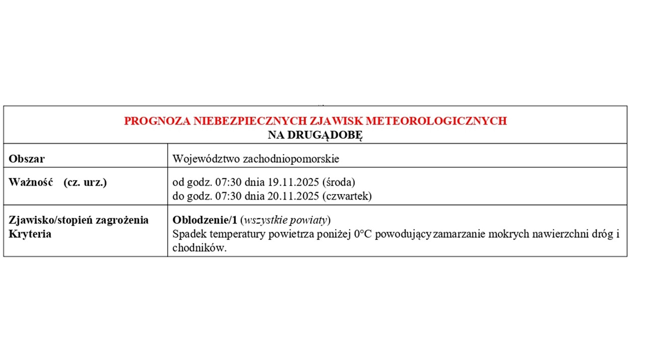 OSTRZEŻENIE METEOROLOGICZNE 19.11.2025 R.- 22.11.2025 R.