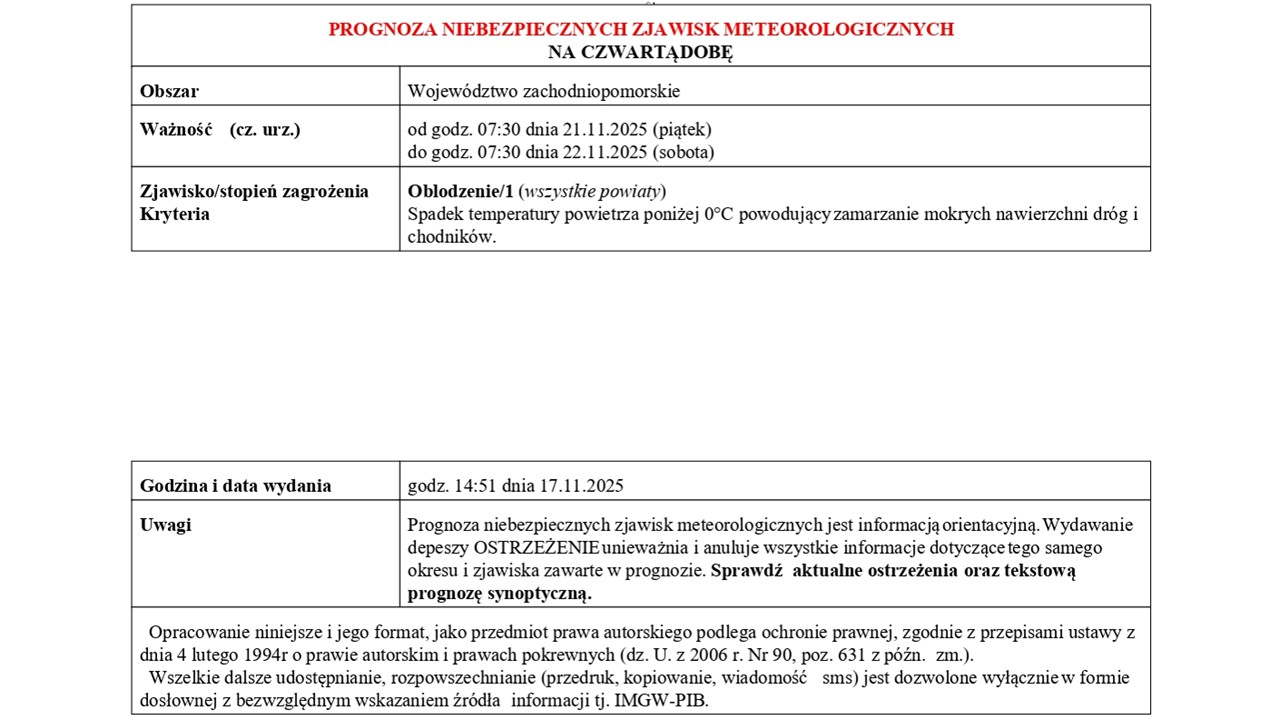 OSTRZEŻENIE METEOROLOGICZNE 19.11.2025 R.- 22.11.2025 R. MOŻLIWE OBLODZENIA…