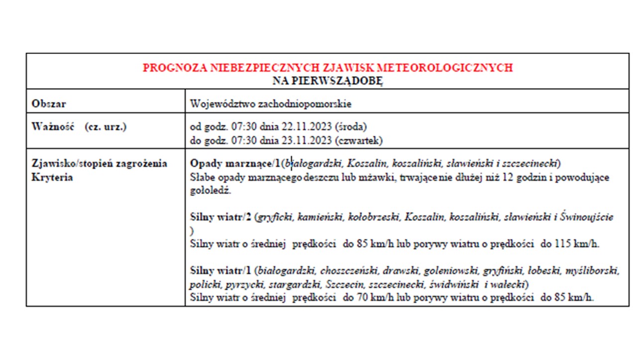OSTRZEŻENIE METEOROLOGICZNE 22-23 LISTOPADA 2023 R.