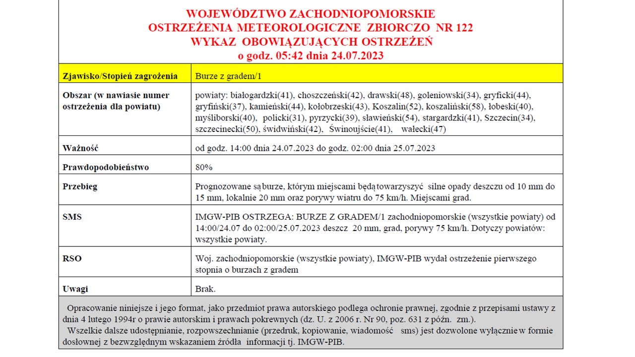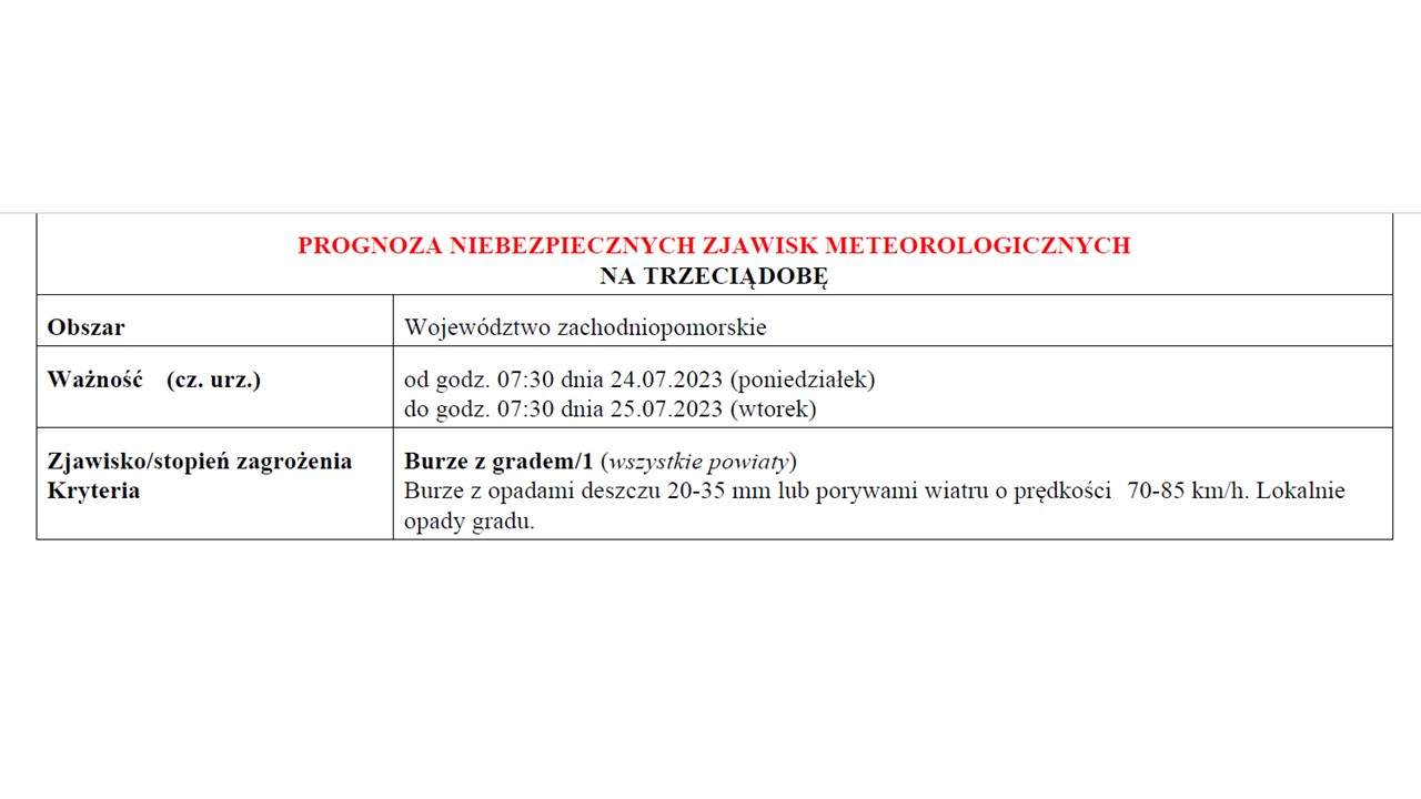 OSTRZEŻENIE METEOROLOGICZNE 24-25 LIPCA 2023 R.