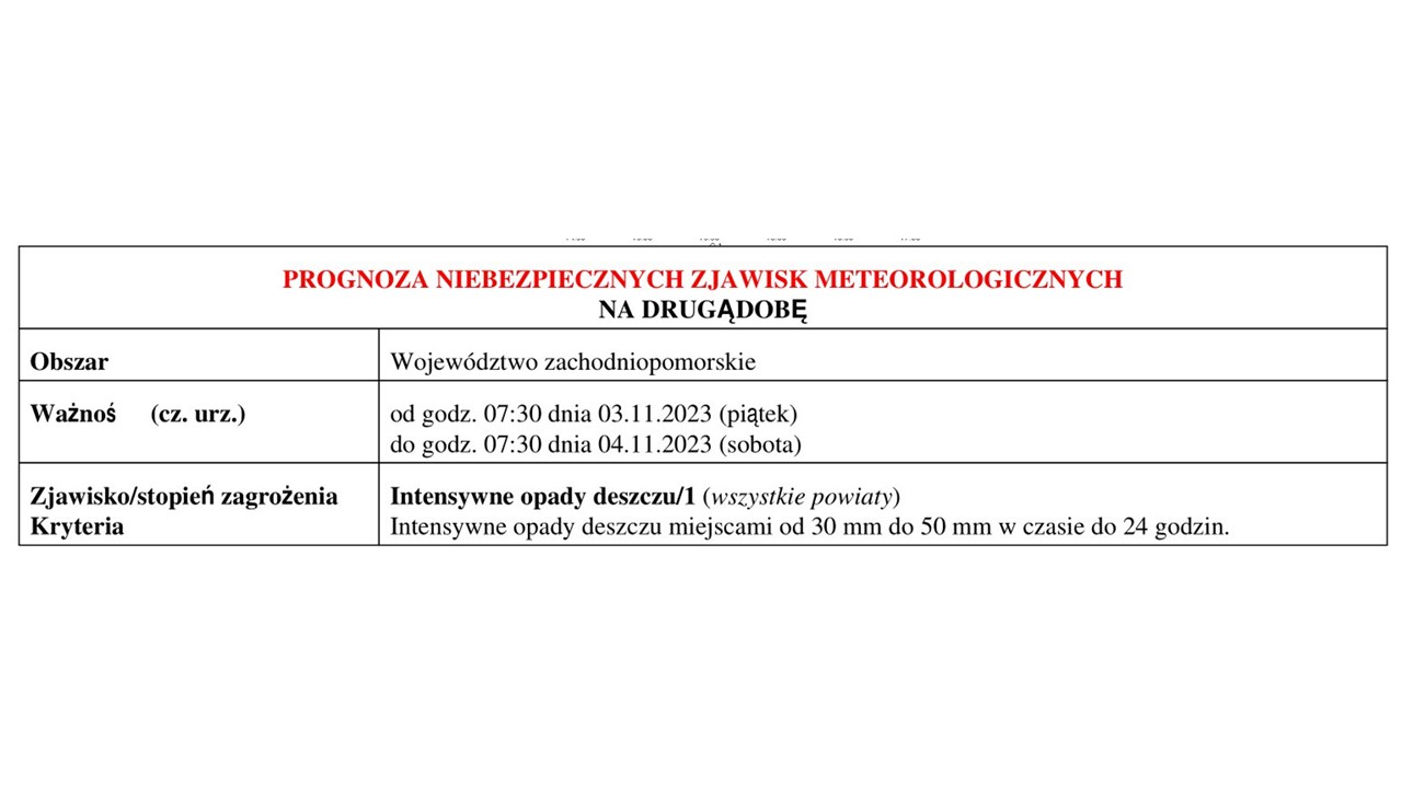 OSTRZEŻENIE METEOROLOGICZNE 3-4 LISTOPAD 2023 R.