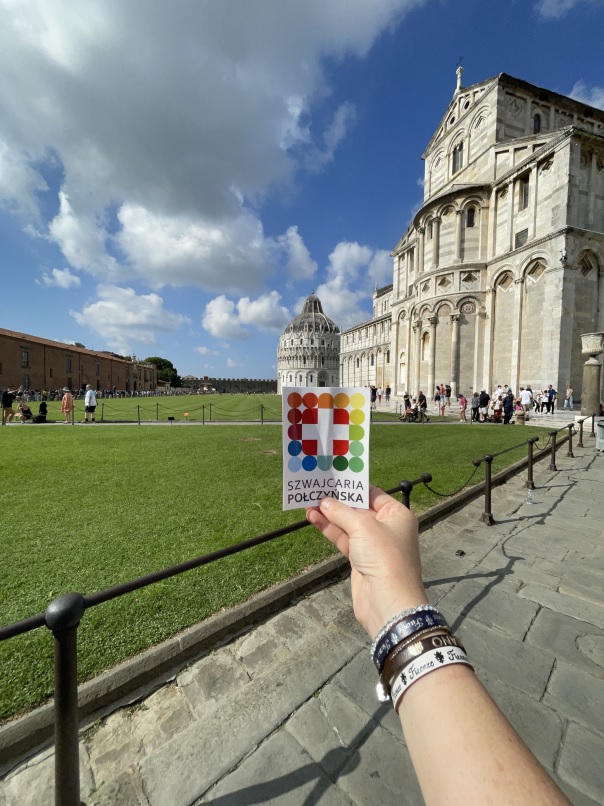 Zdjęcie przesłane przez Panią Aleksandrę z Włoch z naklejką z logo Szwajcarii Połczyńskiej