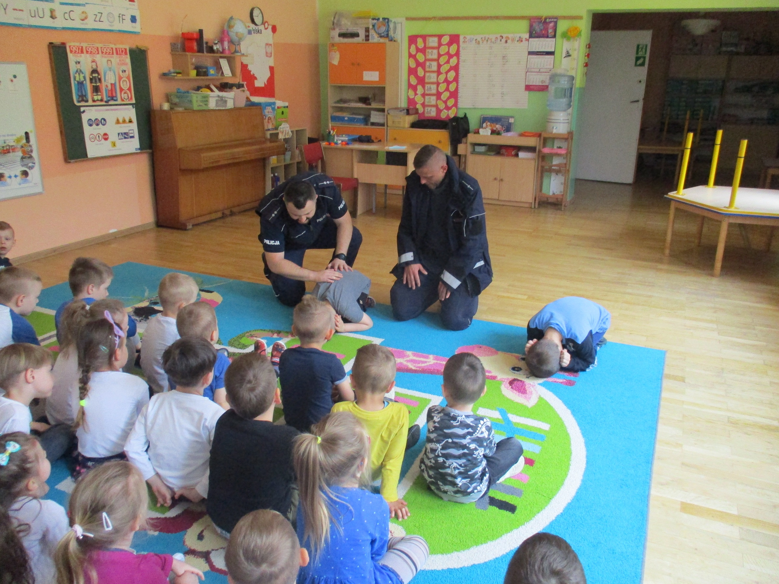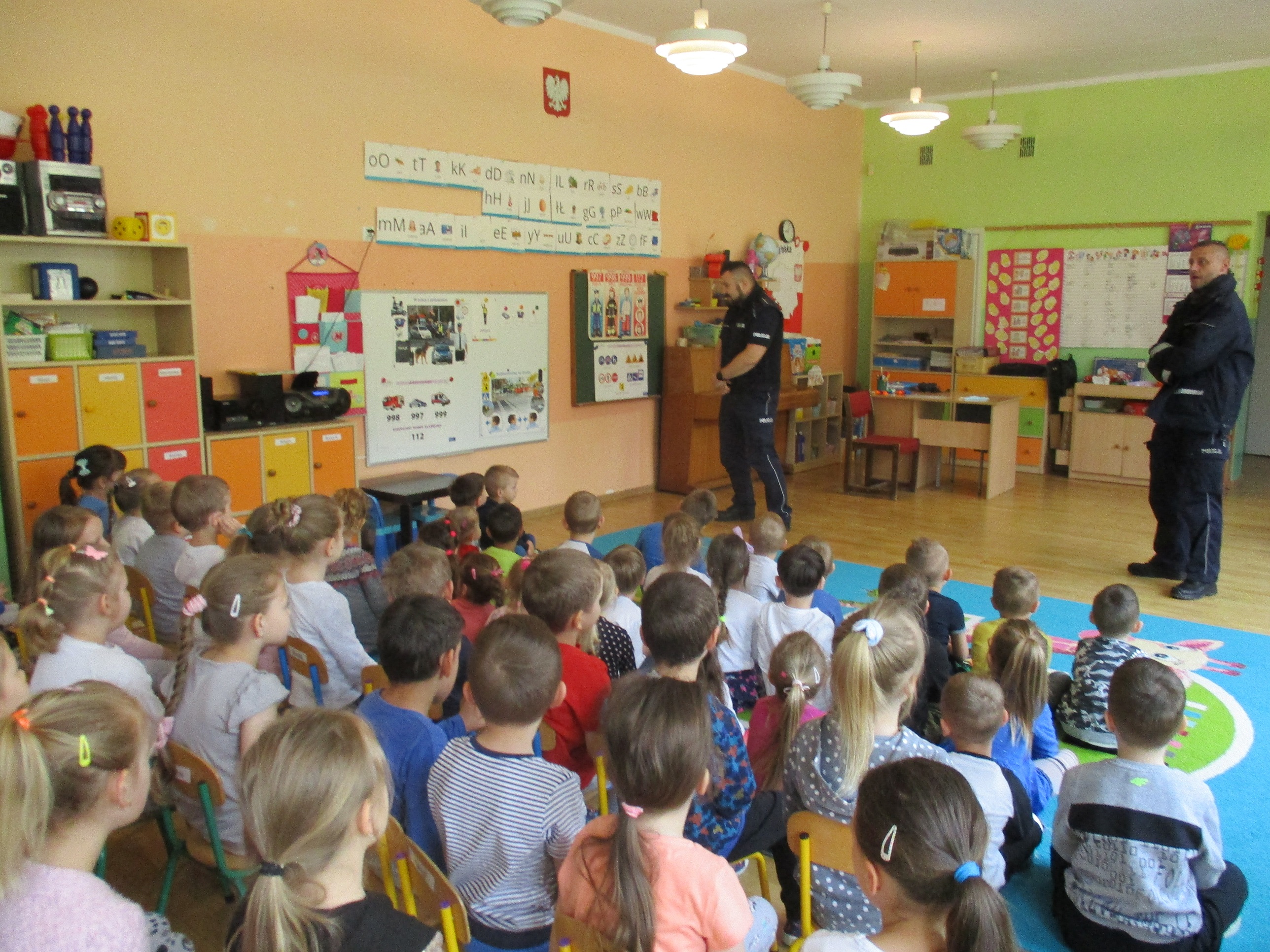 Przedszkolaki z Przedszkola Samorządowego nr 2 „Pod Jarzębinką” w Połczynie - Zdroju wiedzą, jak zachować się w chwili zagrożenia, jak wezwać pomoc. Potrafią być bezpiecznymi uczestnikami ruchu drogowego. Przekonali się o tym, goszczący w naszym przedszkolu policjanci asp. Mariusz Lewandowski i mł. asp. Bartłomiej Fabisiak z Komisariatu Policji w Połczynie – Zdroju.