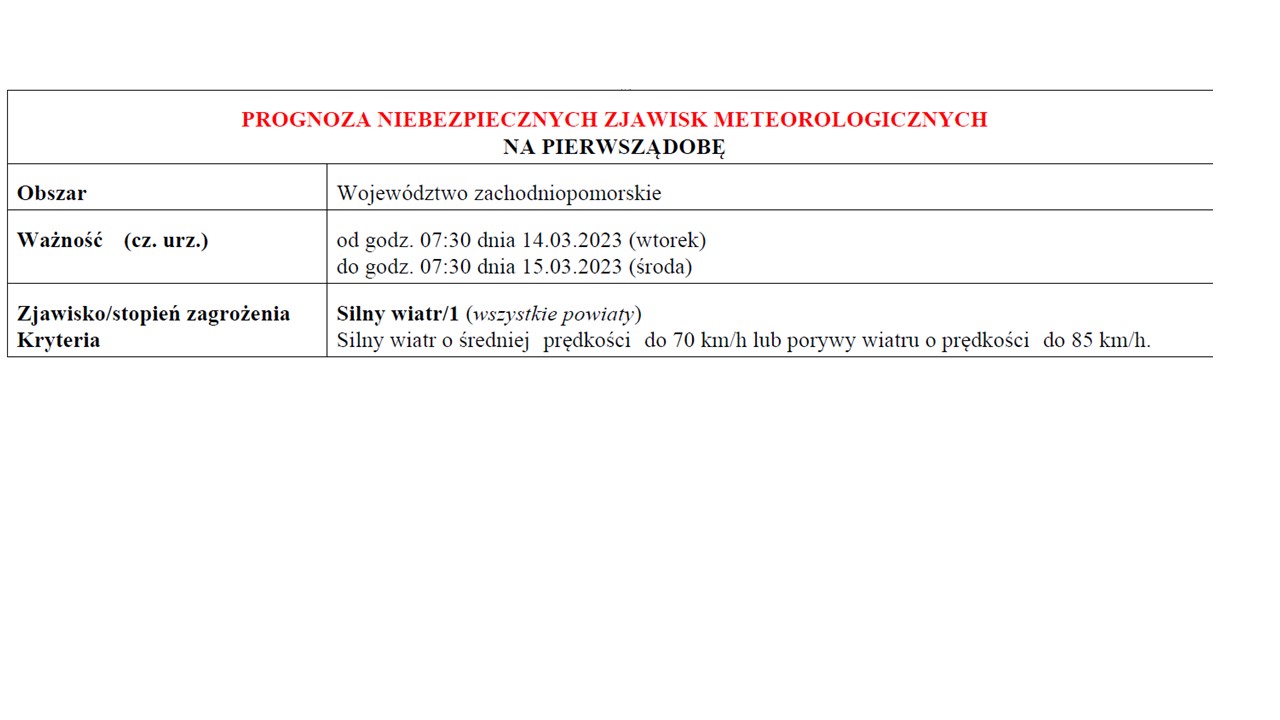 PROGNOZA NIEBEZPIECZNYCH ZJAWISK METEOROLOGICZNYCH 14-15 marca 2023r.