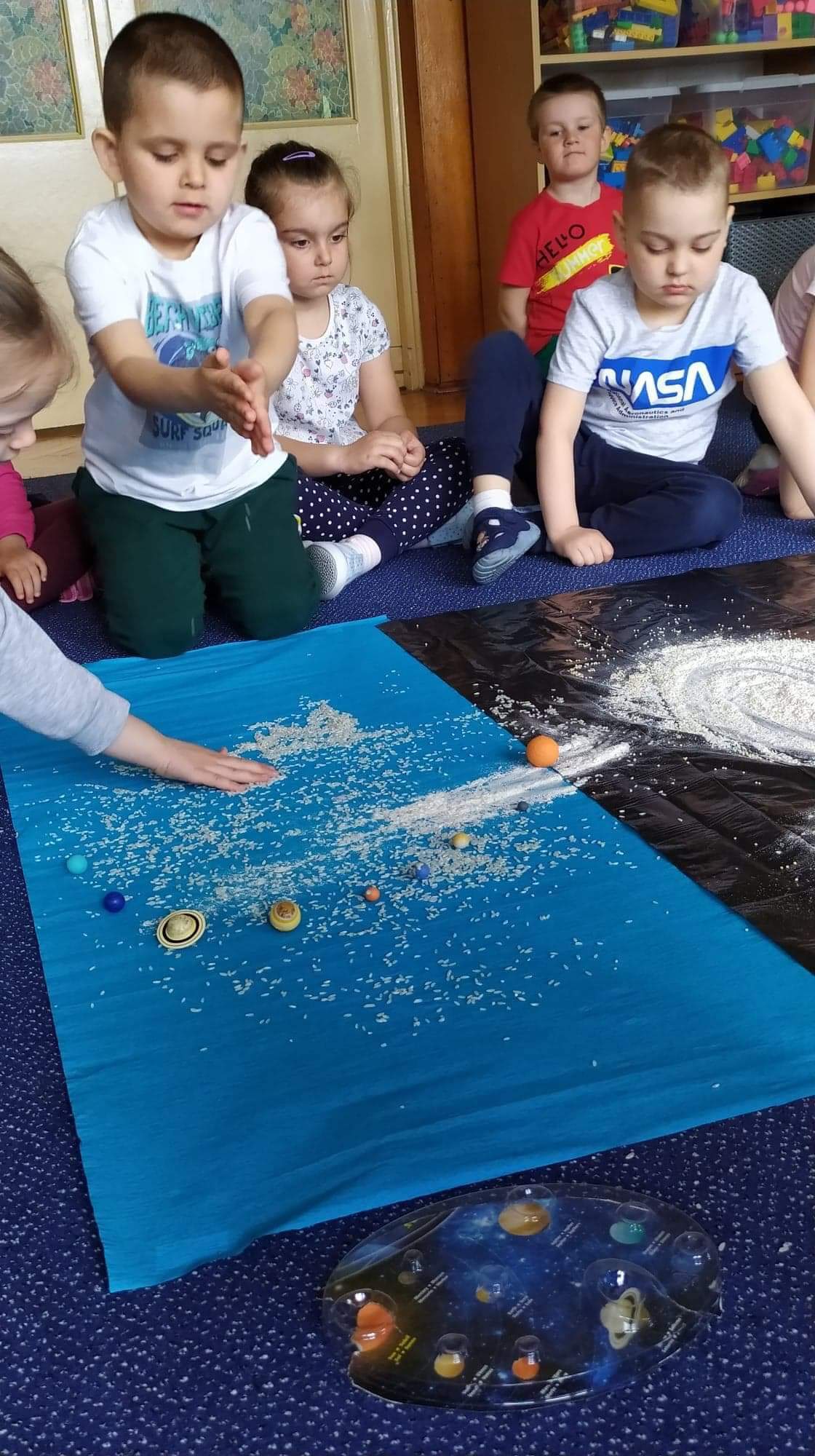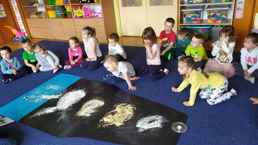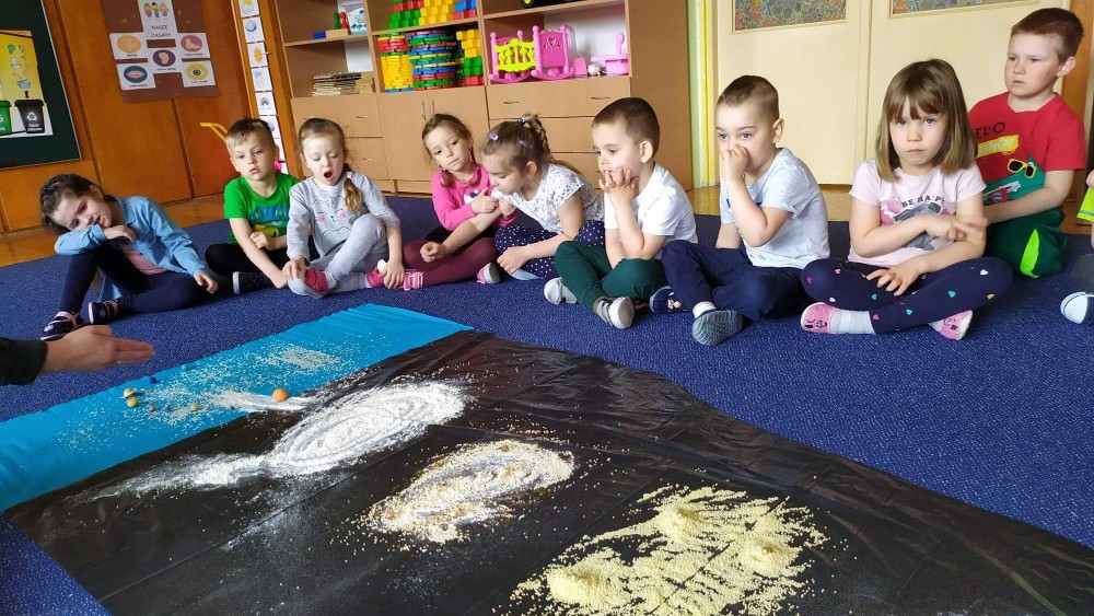 Dzieci poznały także historię powstania wszechświata na podstawie Wielkiej Opowieści Montessori. A wszystko zaczęło się od Wielkiego Wybuchu. Materia, która początkowo skupiona była blisko siebie zaczęła się rozszerzać, tworząc co raz to nową przestrzeń, a jej cząsteczki łączyły się tworząc najpierw atomy, potem pierwiastki, które stworzyły gwiazdy, galaktyki i następnie planety... .