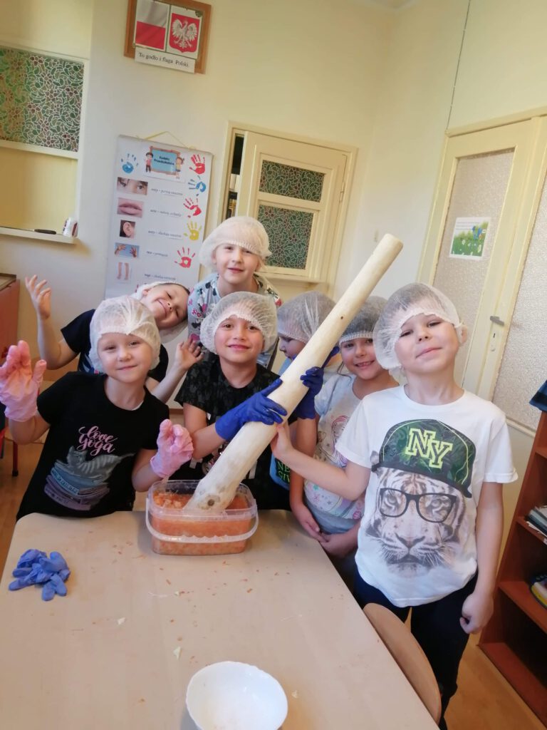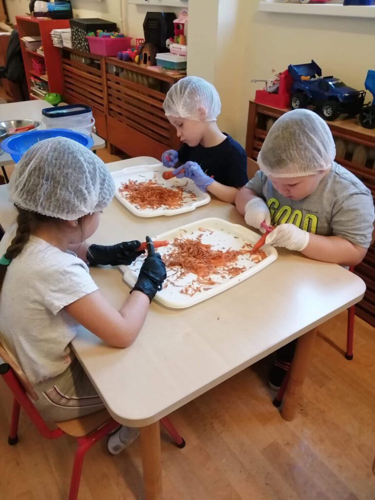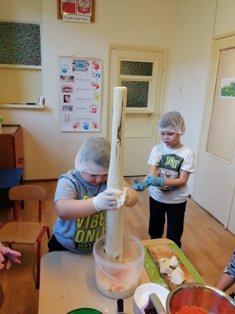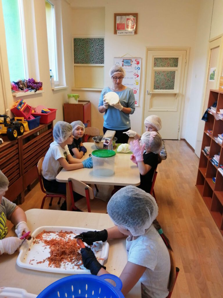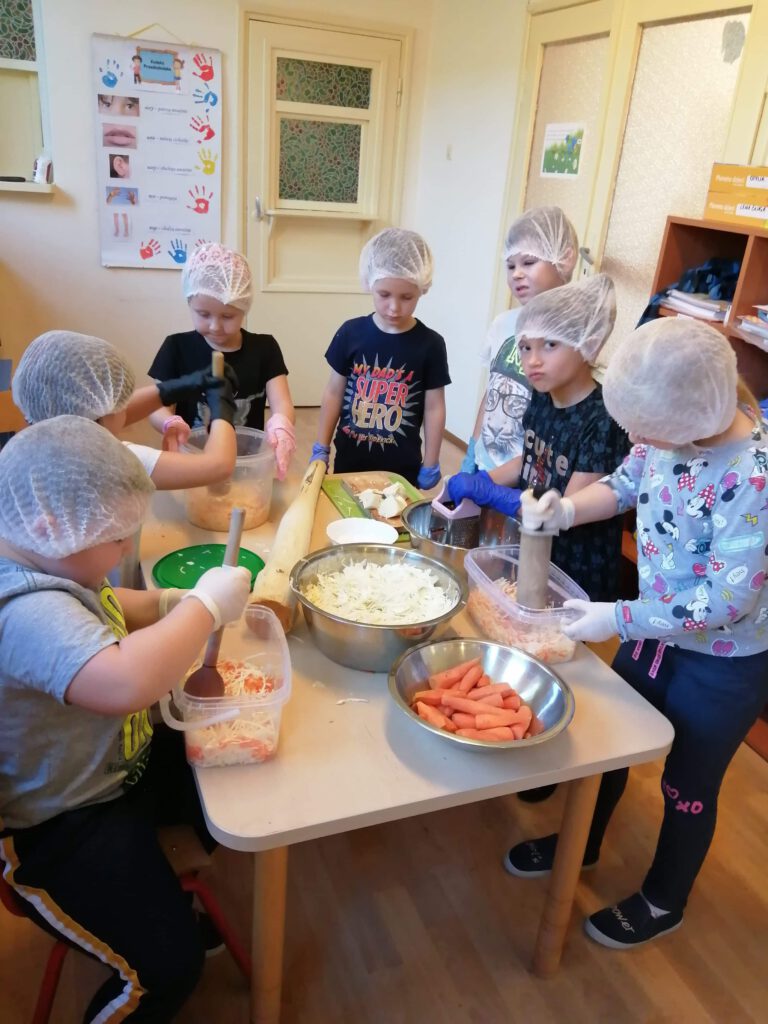 Październik to czas kiszenia kapusty na zimę, bez której trudno sobie wyobrazić tradycyjną polską kuchnię.Dzieci z grupy Motylki na zajęciach poznały proces powstawania kapusty kiszonej domowym sposobem. Samodzielnie z dużym zaangażowaniem obierały marchewkę, szatkowały kapustę, tarły marchewkę, dodawały sól i koper, a na koniec mocno wszystko ubijały w naczyniu tłuczkiem do kapusty. Tak przygotowaną kapustę będziemy przechowywać w chłodnym przedszkolnym pomieszczeniu, a gdy nadejdzie odpowiedni czas spróbujemy. Mamy nadzieję, że surówki z kiszonej kapusty będą chętniej spożywane przez naszych wychowanków.