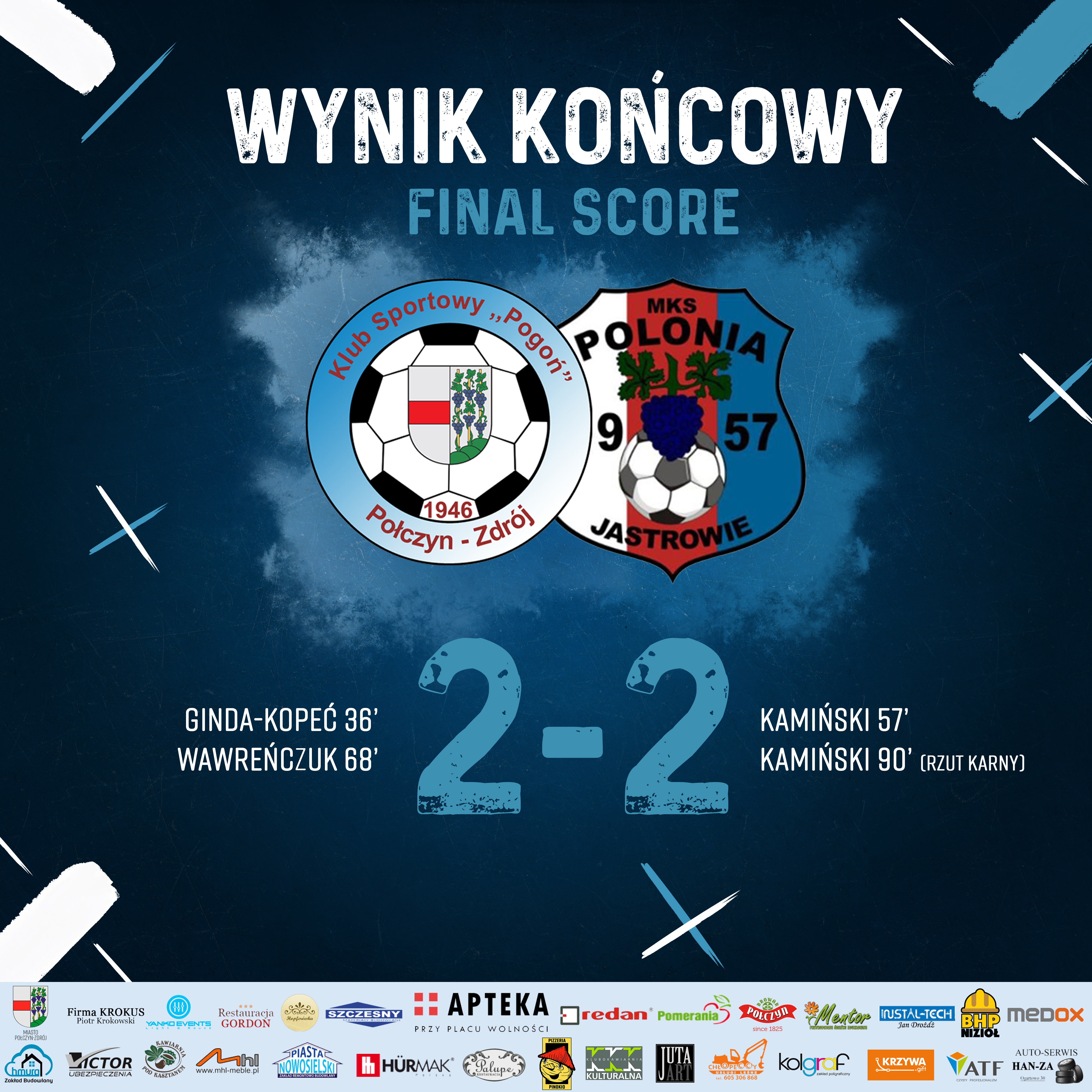 Bramki dla Biało-Niebieskich zdobyli Piotr Ginda-Kopeć oraz Grzegorz Wawreńczuk.