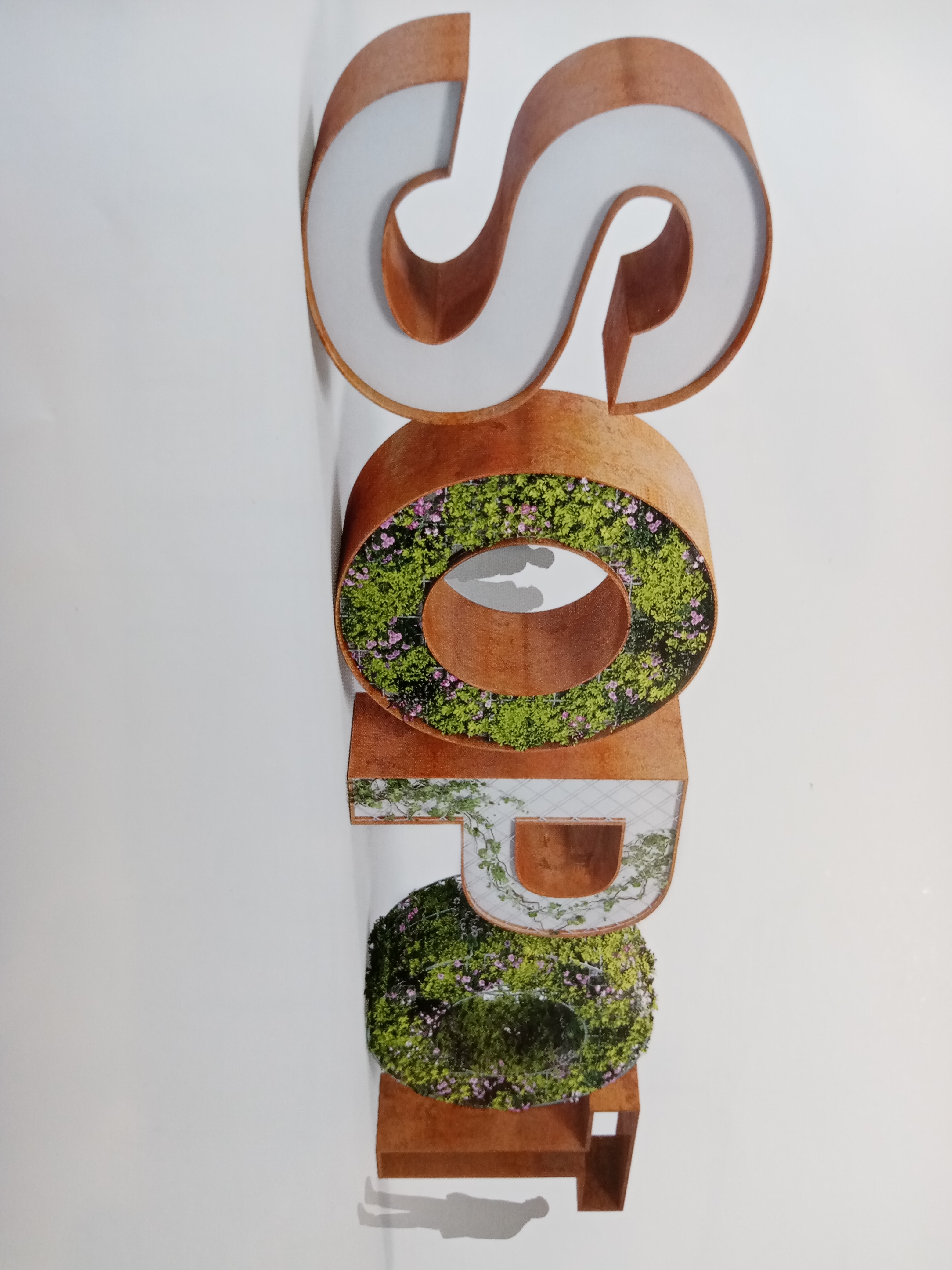 Na fot.: Katalogowa wizualizacja powstającego napisu z nazwą miasta, na przykładzie nazwy „Sopot”. Sylwetka człowieka przedstawia skalę napisu