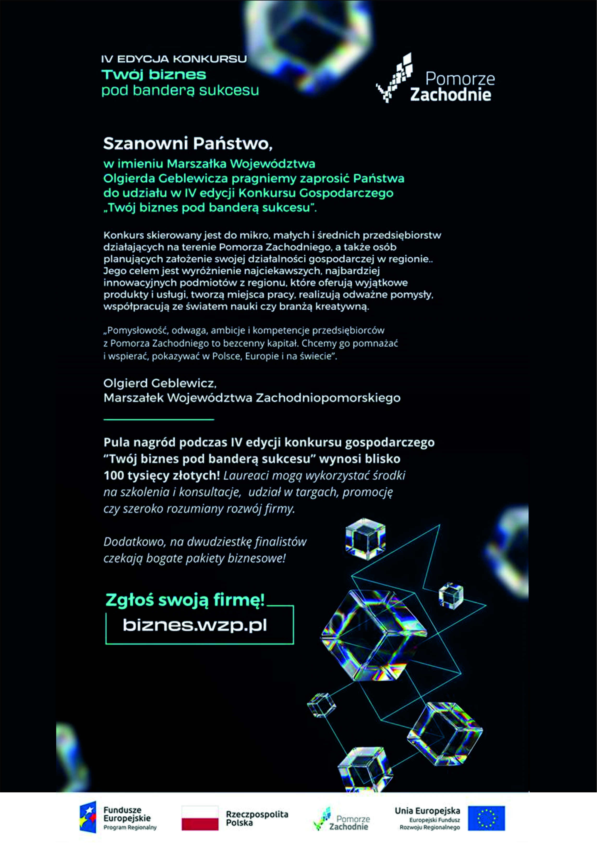 Marszałek Olgierd Geblewicz zaprasza mikro-, małe i średnie przedsiębiorstwa z Pomorze Zachodnie do udziału. Pokaż swój biznes lub pomysł i zyskaj dedykowany Pakiet Biznesowy, a w nim darmowe wsparcie promocyjne i doradcze!