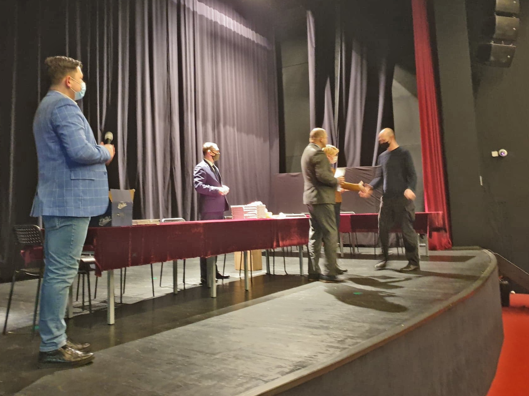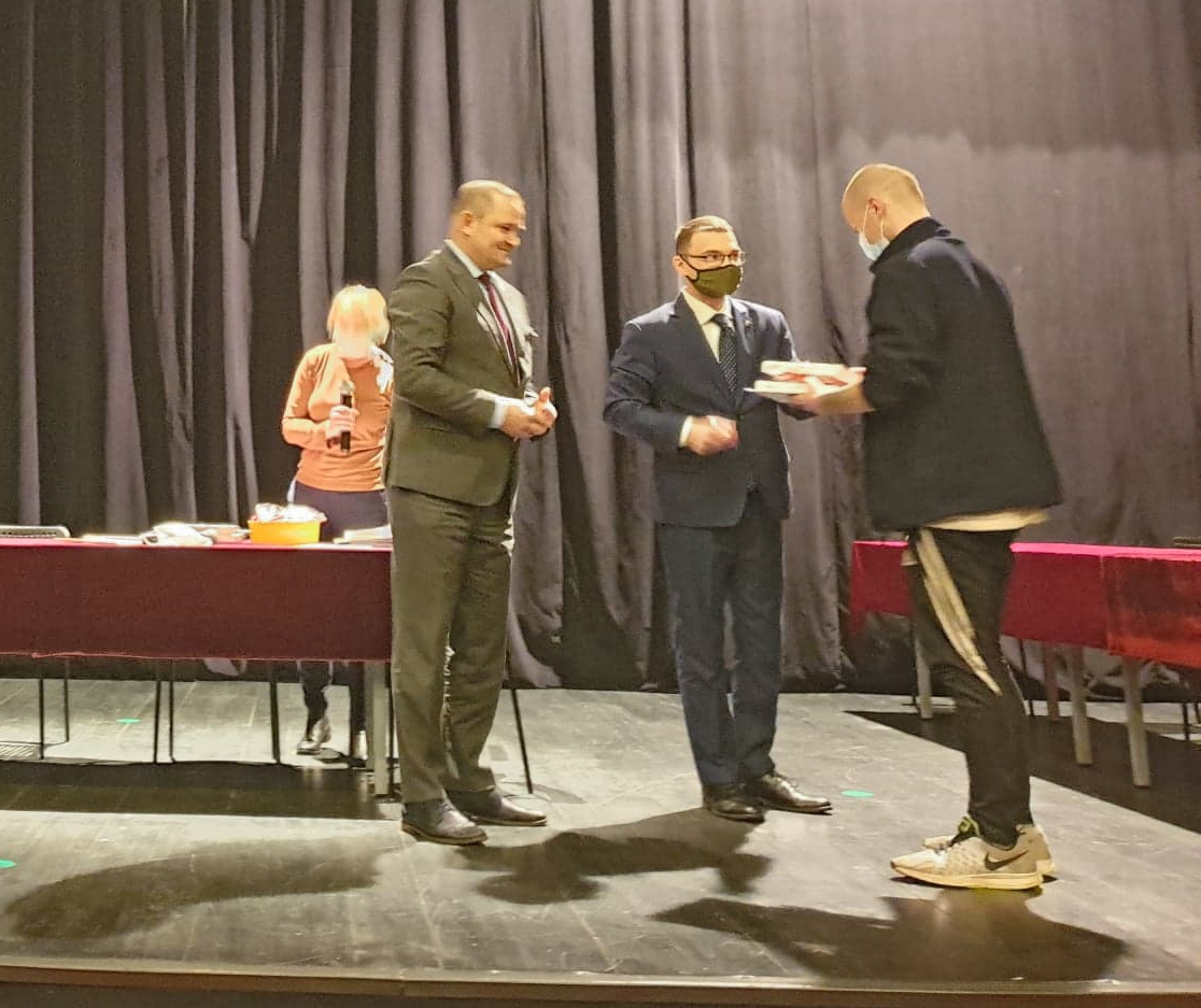 Burmistrz Sebastian Witek wręcza drobne upominki i podziękowania dla solisty ze Studia "Art Voice" z CK - Antka Ostrowskiego.
