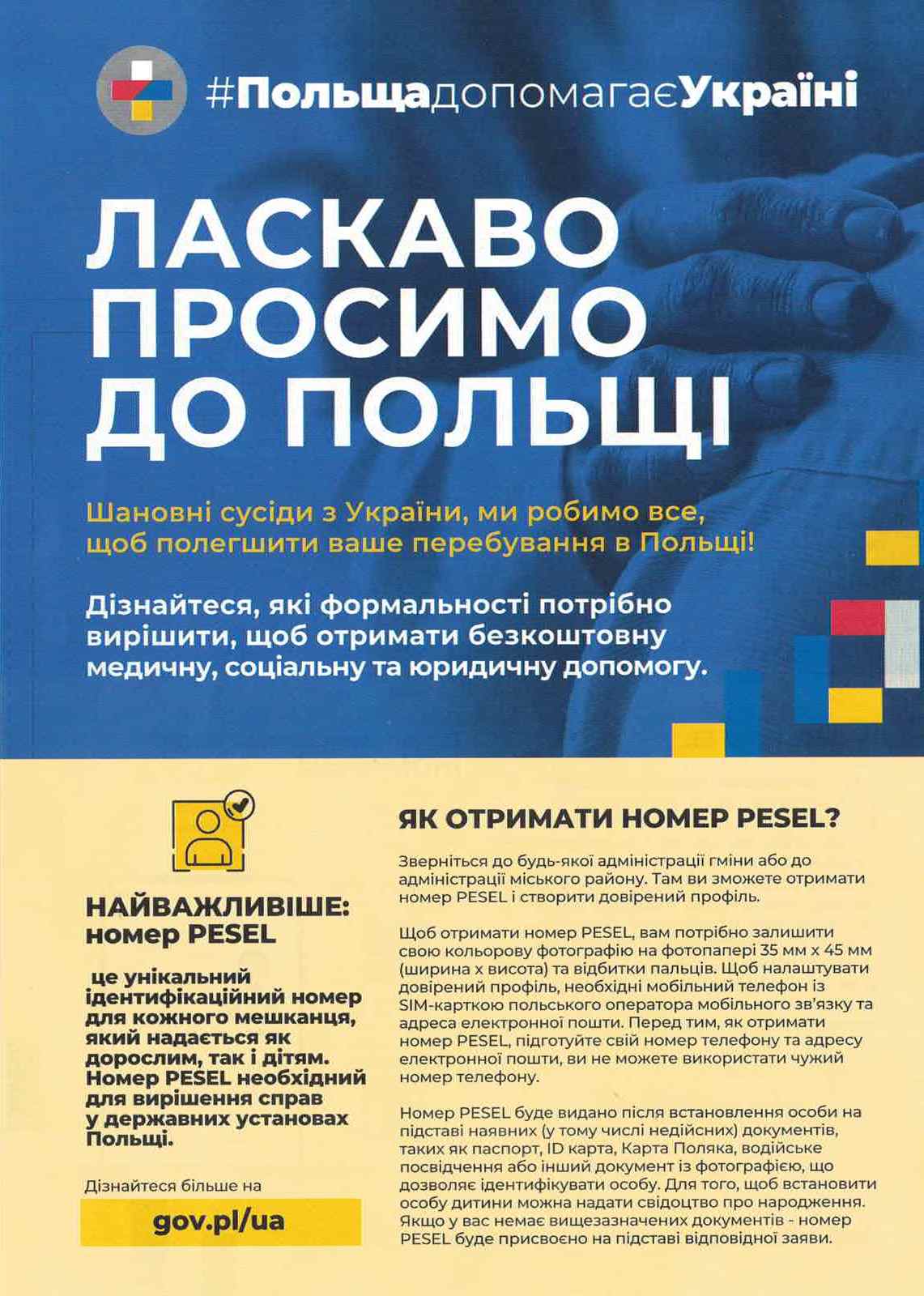 Od 16 marca będzie możliwość nadania numeru PESEL dla uchodźców z Ukrainy, którzy chcą pozostać w Polsce. Uprzejmie prosimy, aby nie wszyscy chętni udawali się pierwszego dnia do Urzędu.
