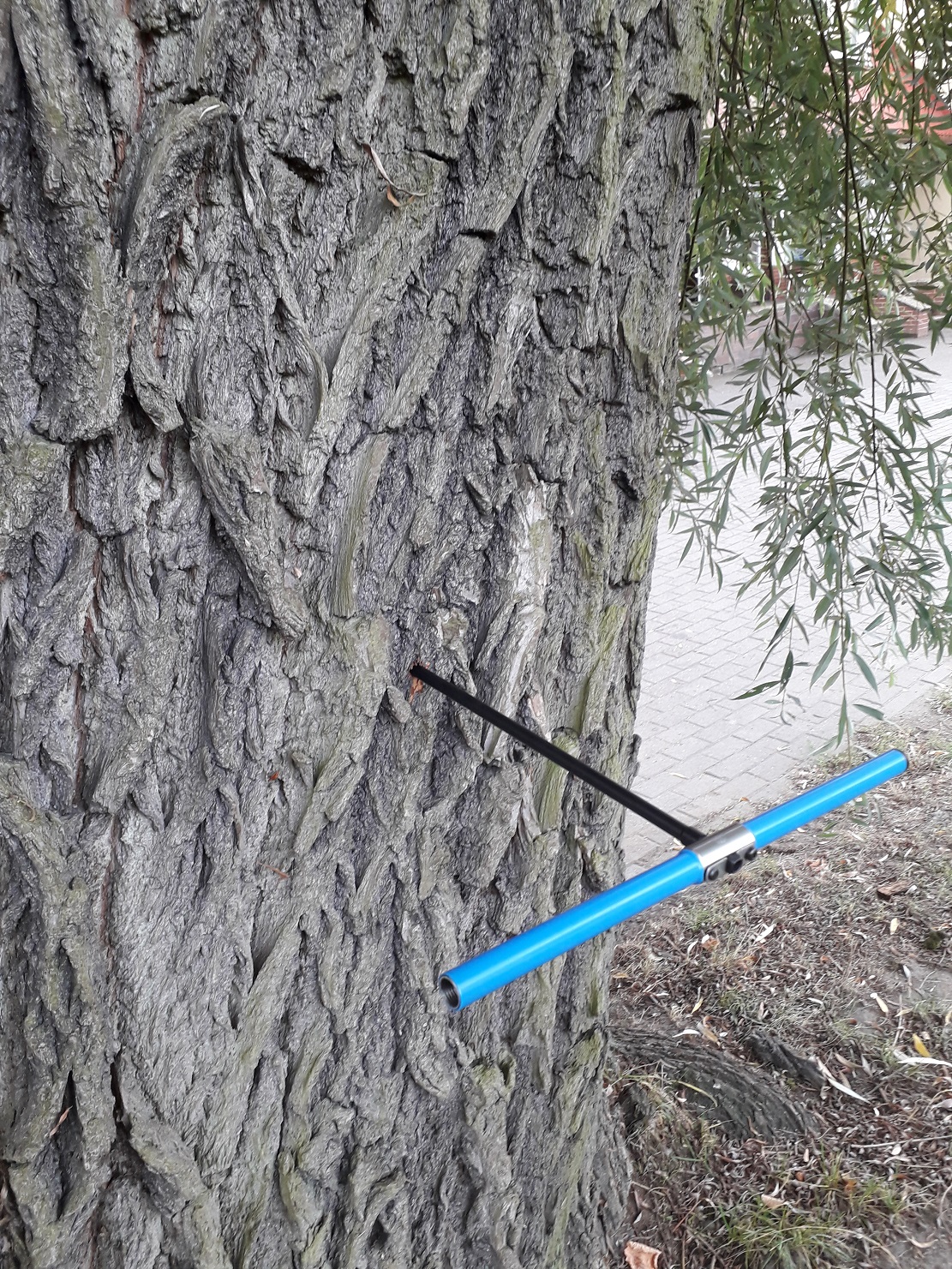 Na zdjęciach widać m.in. oględziny oraz przekrój przez pień wierzby po jej usunięciu, wskazujący na znaczne wewnętrzne wypróchnienie.