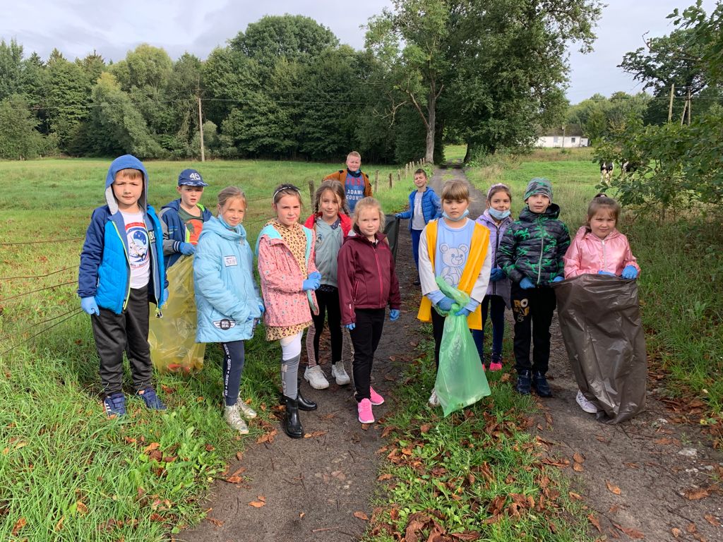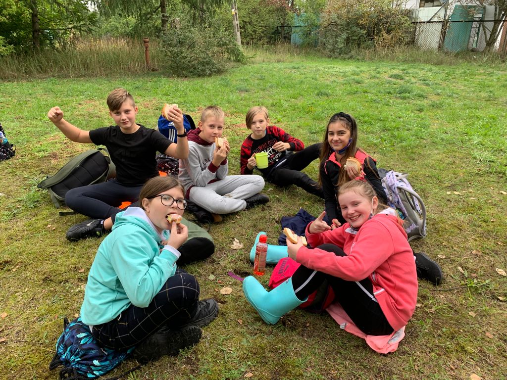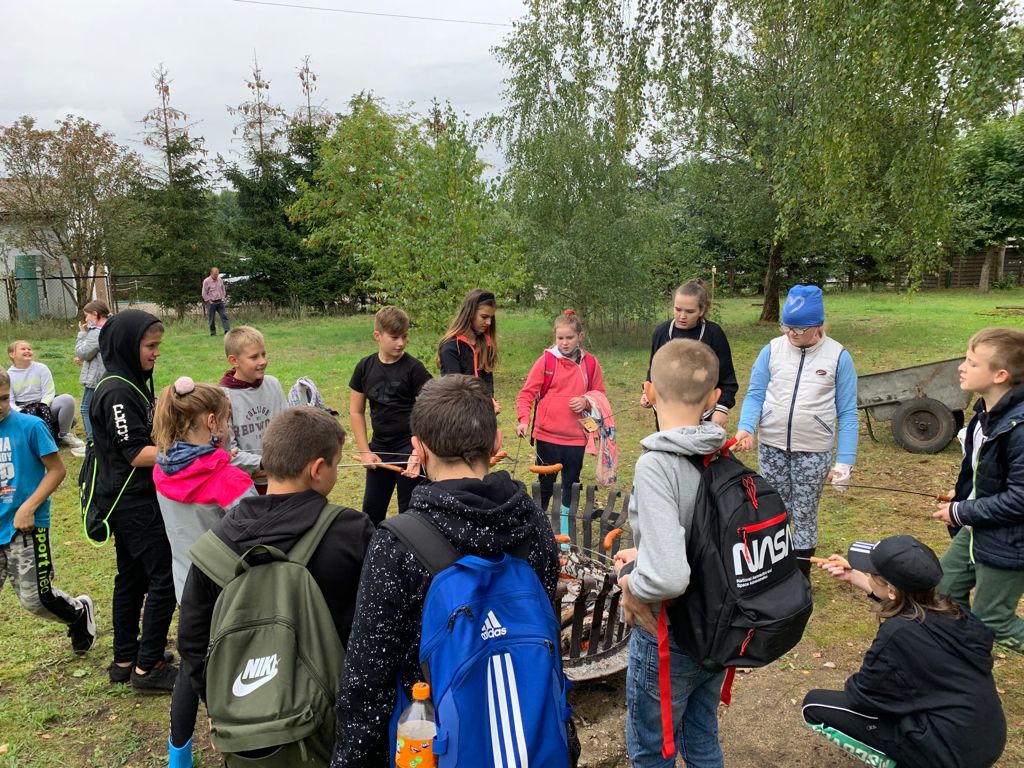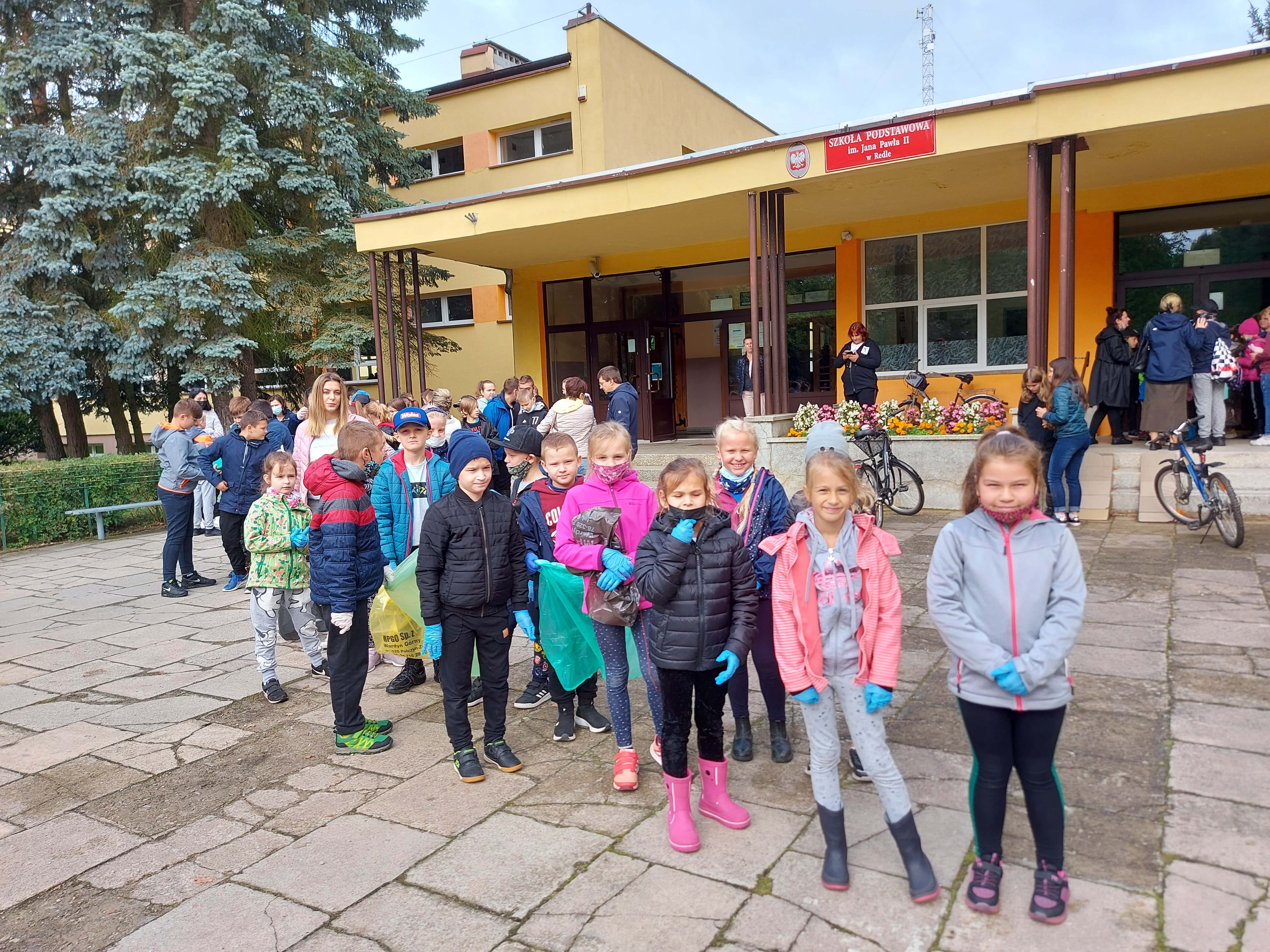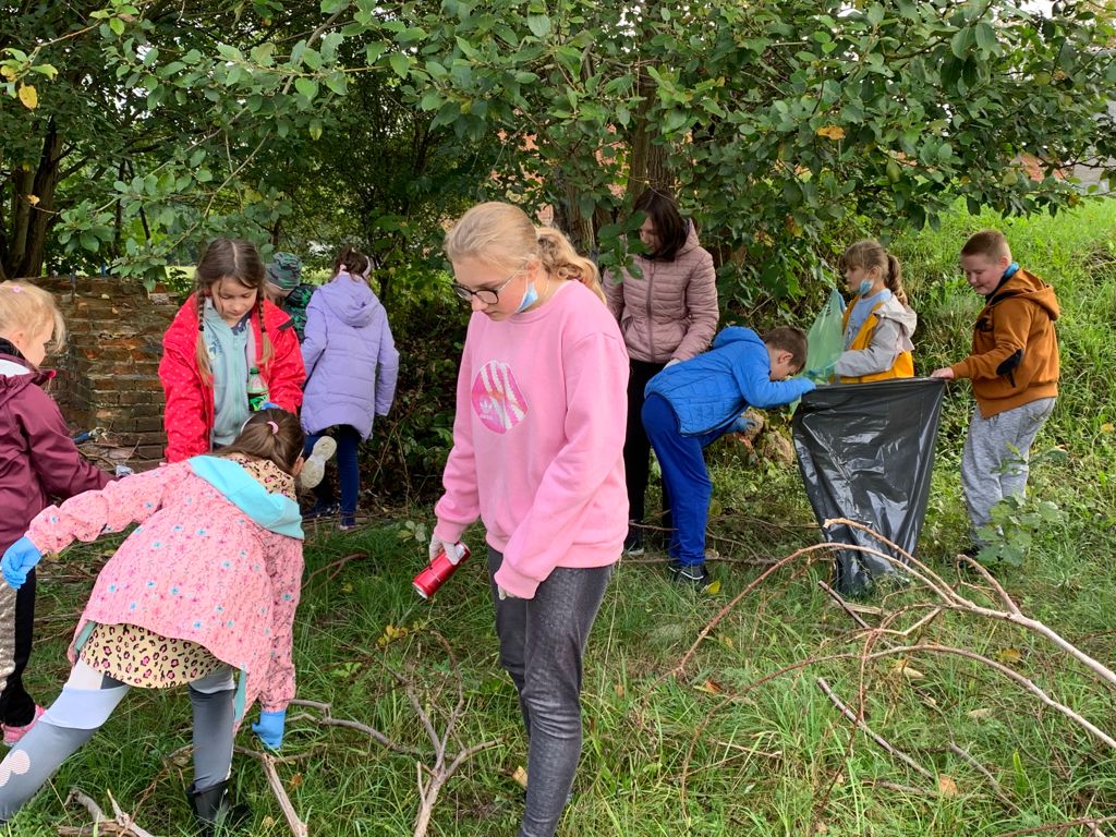 W tym samym czasie uczniowie z klas młodszych uczestniczyli w akcji sprzątania świata. Każde dziecko wyposażone zostało w ochronne rękawiczki oraz worki do segregacji odpadów. Grupy uczniów wraz z opiekunami udały się w wyznaczone do uprzątnięcia obszary, dzięki czemu chodniki oraz tereny zielone w Redle cieszą oko. Czas, po wielkim sprzątaniu uczniowie spędzili przy ognisku, piekąc kiełbaski.