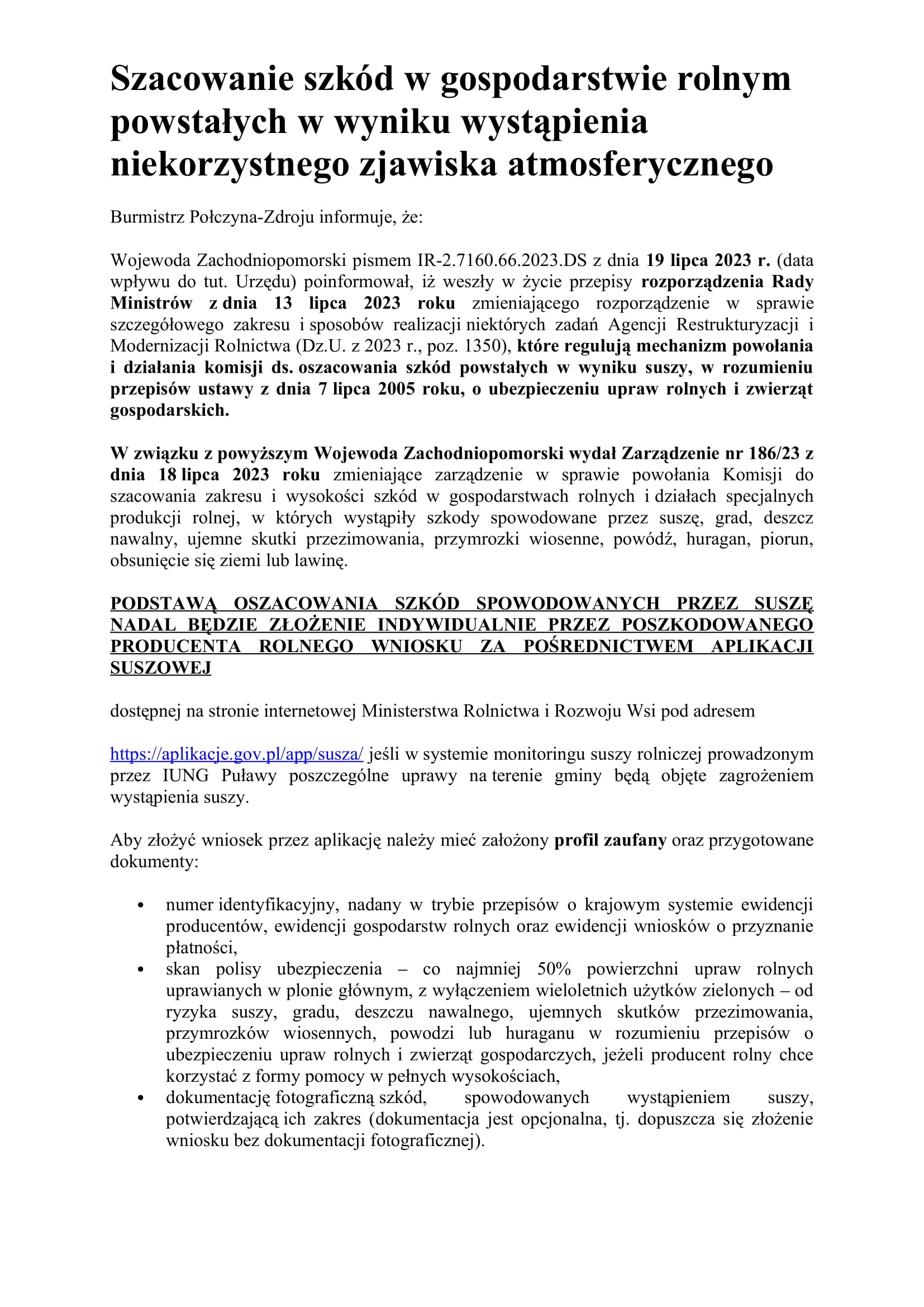 Z uwagi na to, że żniwa już się rozpoczęły rolnicy, mogą wnioskować do gminnej komisji o oszacowanie szkód spowodowanych przez suszę. Komisja szacuje niezależnie od terminu złożenia wniosku poprzez aplikację. Rolnicy wnioskując o oszacowanie przez Komisje, muszą zwrócić uwagę na to, aby wpisane we wniosku dane co do rodzaju i areału upraw, były zgodne ze złożonym wnioskiem o płatności obszarowe.