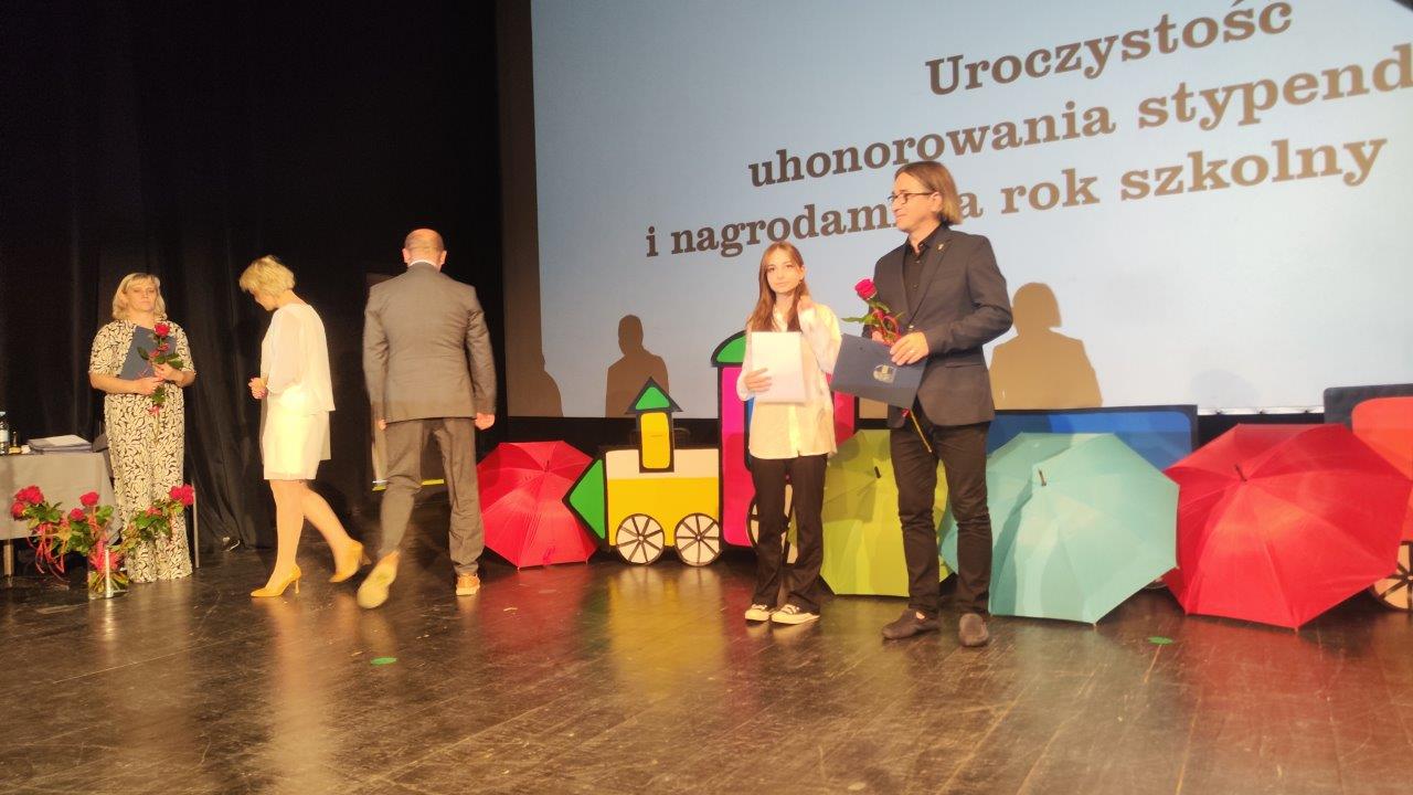 z Emilią Mazur, Zastępcą Burmistrza oraz Wojciechem Halcem – Przewodniczącym Komisji Oświaty, Kultury i Sportu, wręczyli stypendia i nagrody wyróżnionym uczniom
