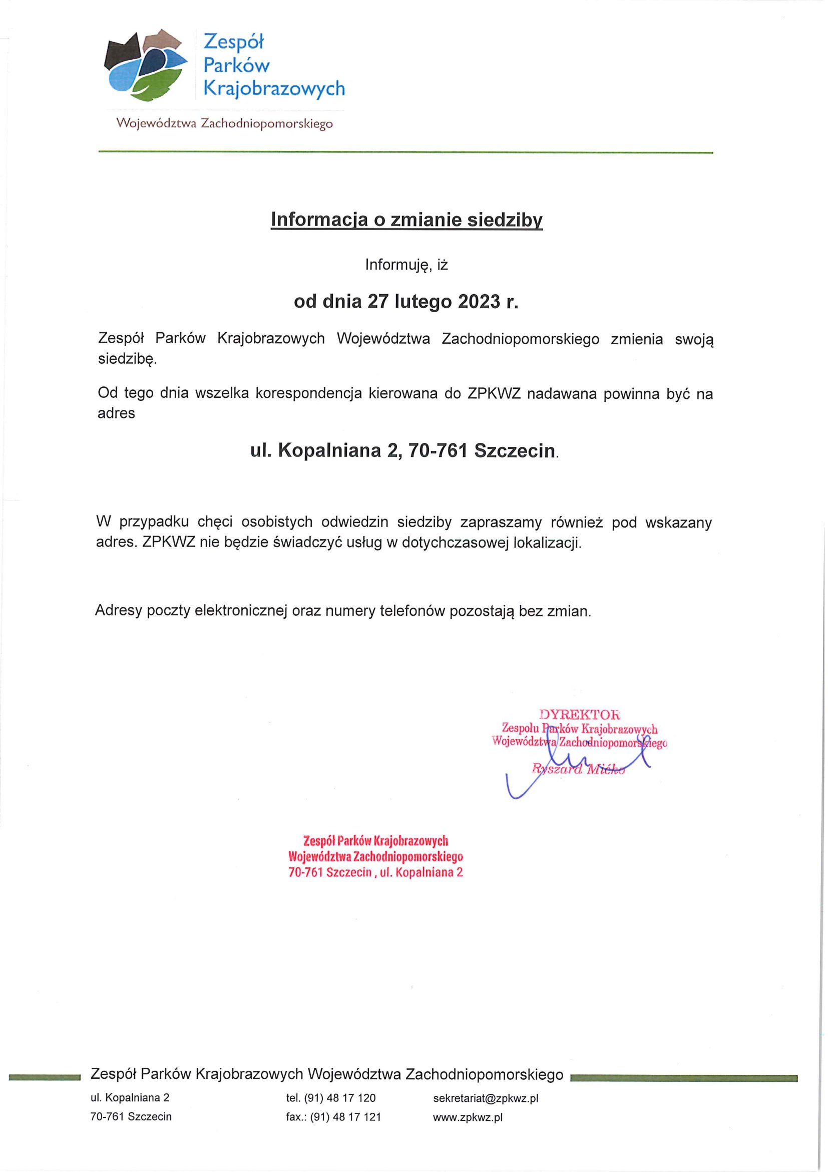 ZMIANA SIEDZIBY ZESPOŁU PARKÓW KRAJOBRAZOWYCH WOJEWÓDZTWA ZACHODNIOPOMORSKIEGO W SZCZECINIE